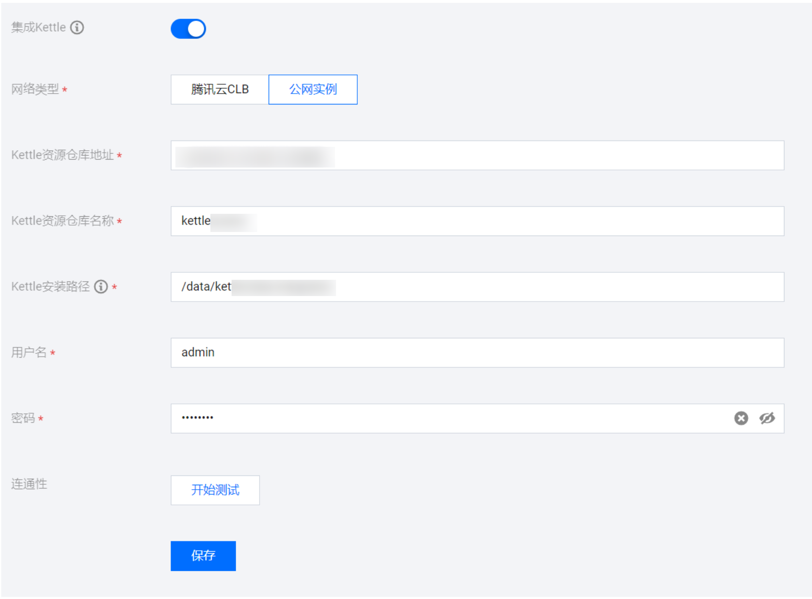 开启时需要配置 Kettle 资源库地址,可以使用腾讯云 CLB 或公网实例,保证 WeData 可以通过配置的 VPC 访问到 Kettle 资源库。