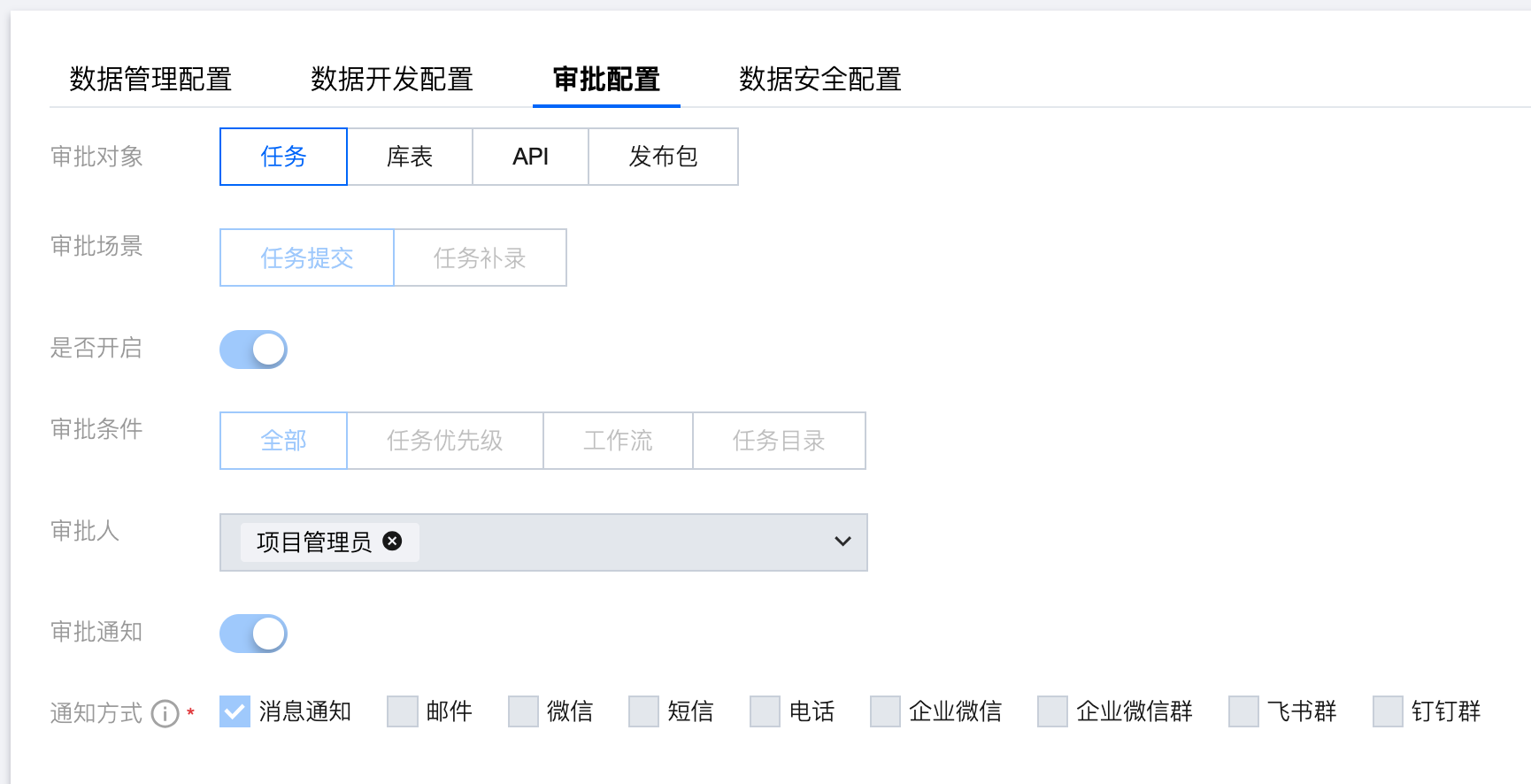 支持针对项目中的数据开发任务、库表、数据服务 API 进行审批流程配置,审批场景分别为任务提交调度、申请数据库表权限以及申请数据服务 API 权限。