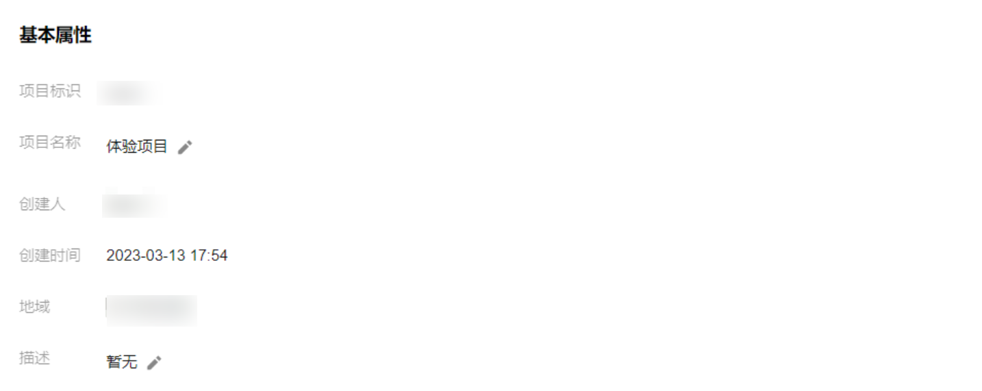 基本属性可以查看当前项目的项目标识、项目名称、创建人、创建时间、所属地域、描述信息。其中项目名称与项目描述支持编辑修改。