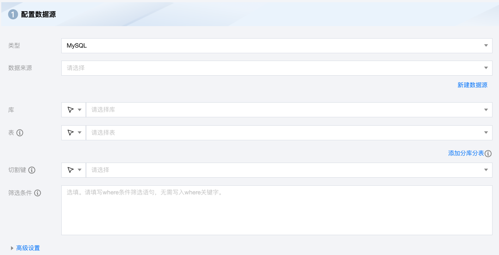 筛选条件(选填) | 在实际业务场景中,通常会选择当天的数据进行同步,将 where 条件指定为 gmt_create>$bizdate。where 条件可以有效地进行业务增量同步。 如果不填写 where 语句,包括不提供 where 的 key 或 value,数据同步均视作同步全量数据。 不可以将 where 条件指定为 limit 10,这不符合 MySQL WHERE 子句约束。 |