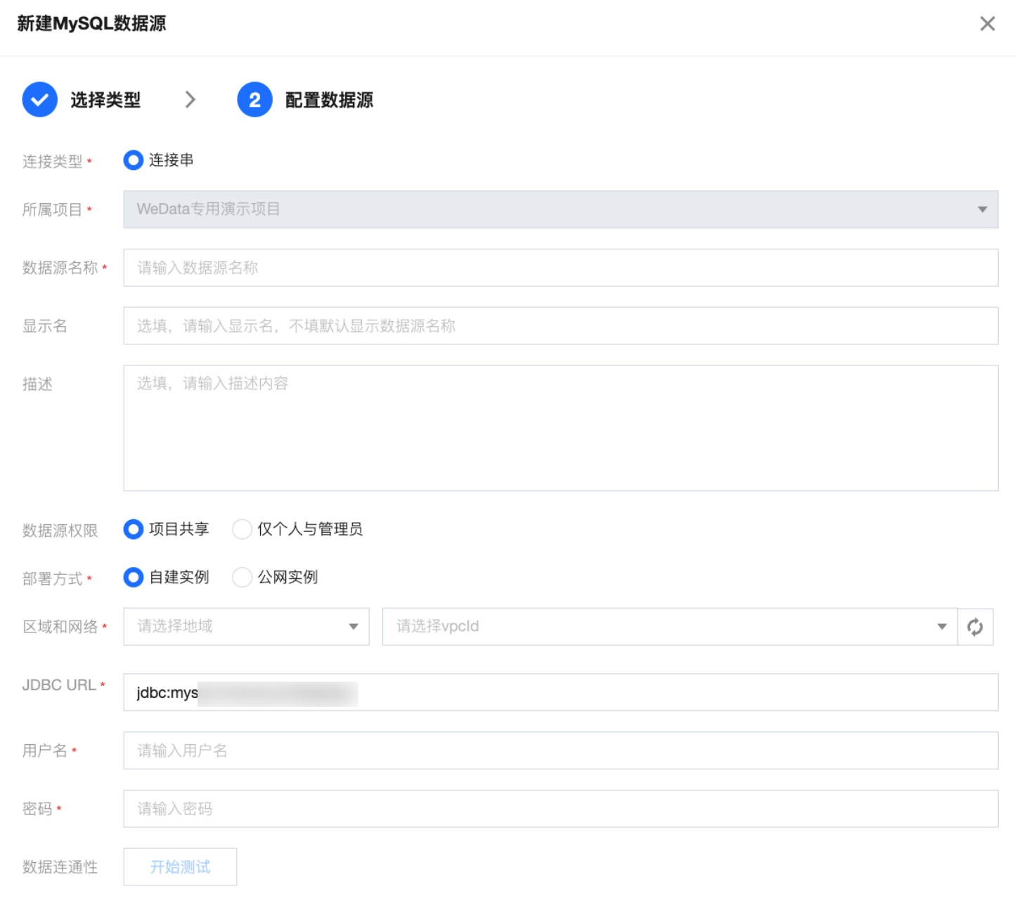 区域与网络 | 当选择自建实例时,需要选择数据源实例所在地域与 vpcID。 |