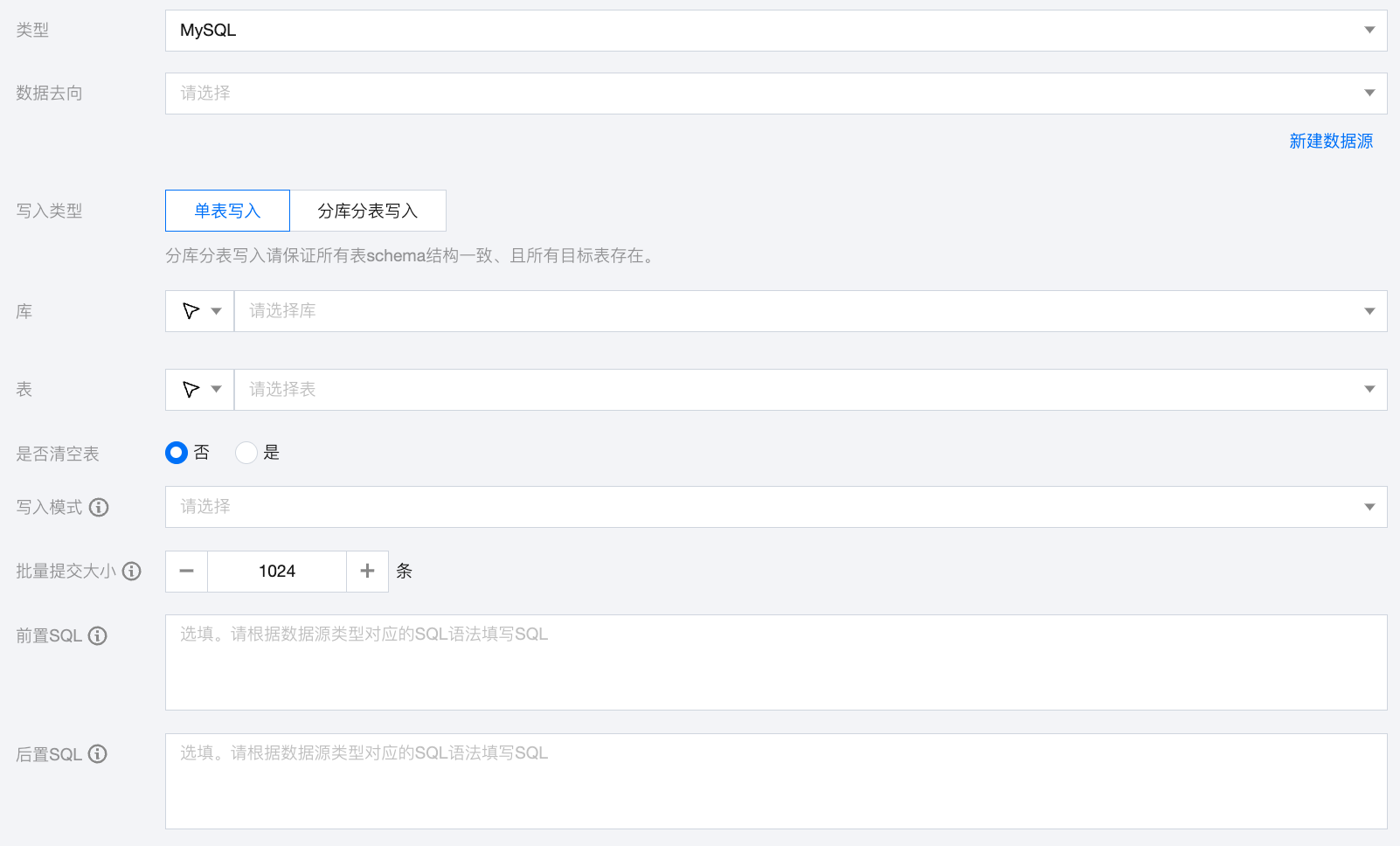 前置 SQL(选填) | 执行同步任务之前执行的 SQL 语句,根据数据源类型对应的正确 SQL 语法填写 SQL,例如,执行前清空表中的旧数据(truncate table tablename)。 |