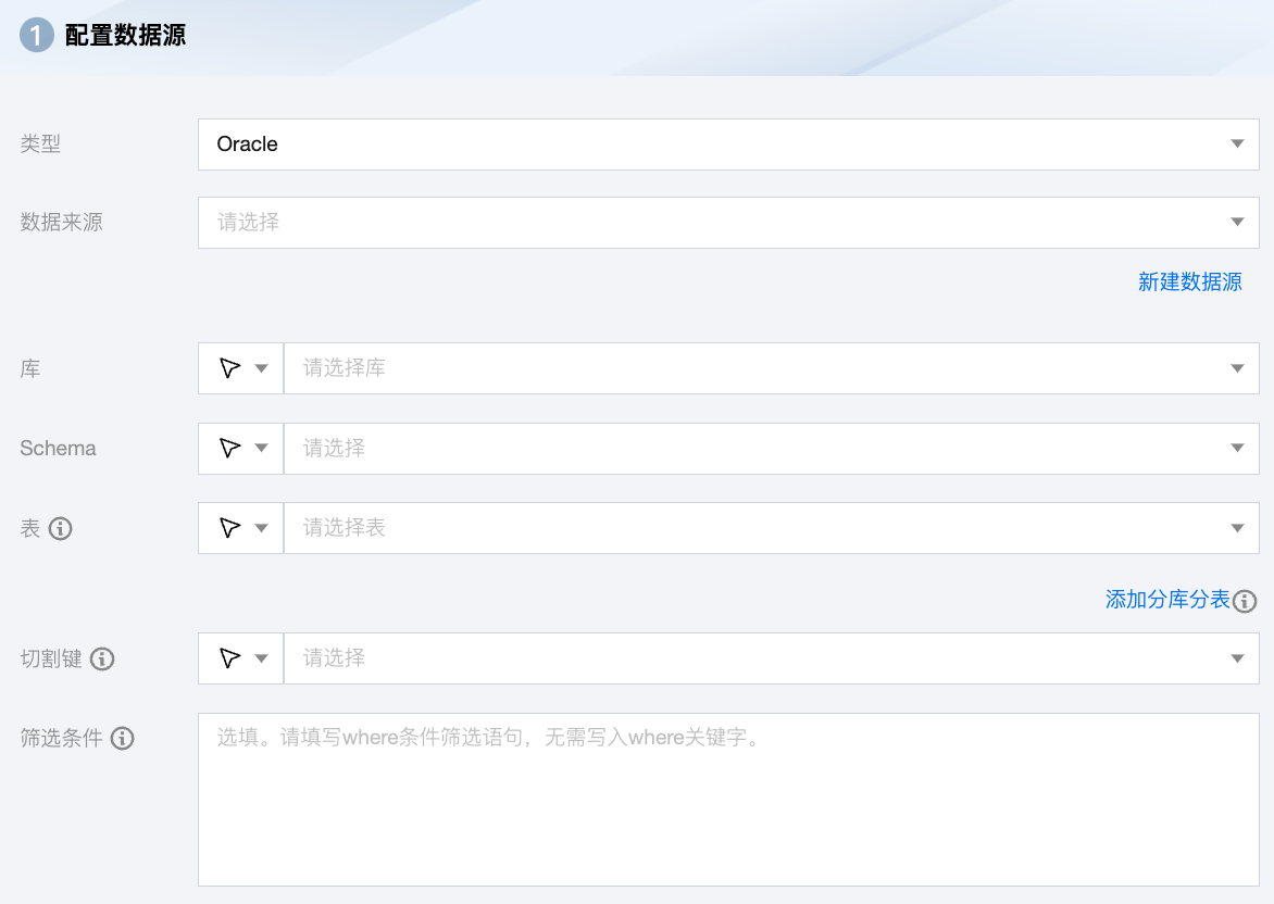 筛选条件(选填) | Oracle 根据指定 where 条件拼接 SQL,并根据该 SQL 进行数据抽取。例如,在测试时指定 where 条件为 row_number()。 where 条件可以有效地进行业务增量同步 。 where 条件不配置或为空时,将视作全表同步数据 。 |