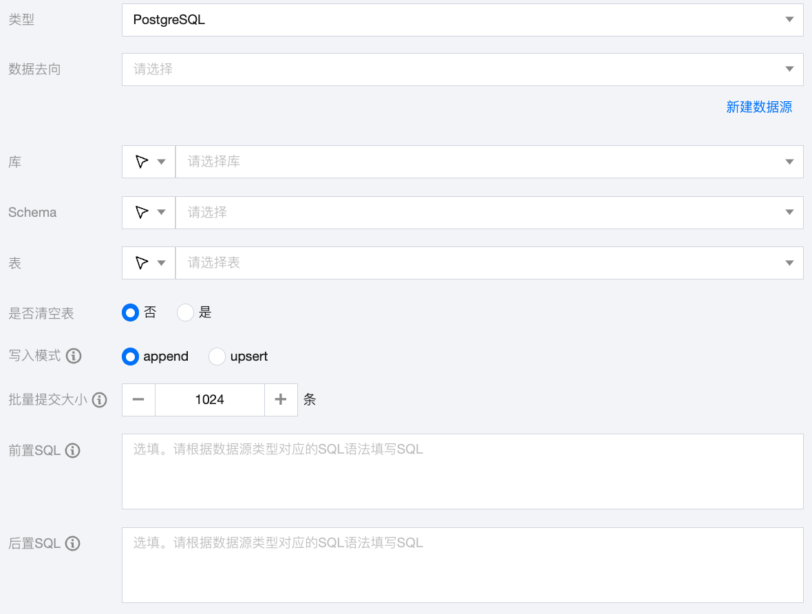 数据去向 | 需要写入的 PostgreSQL 数据源。 |