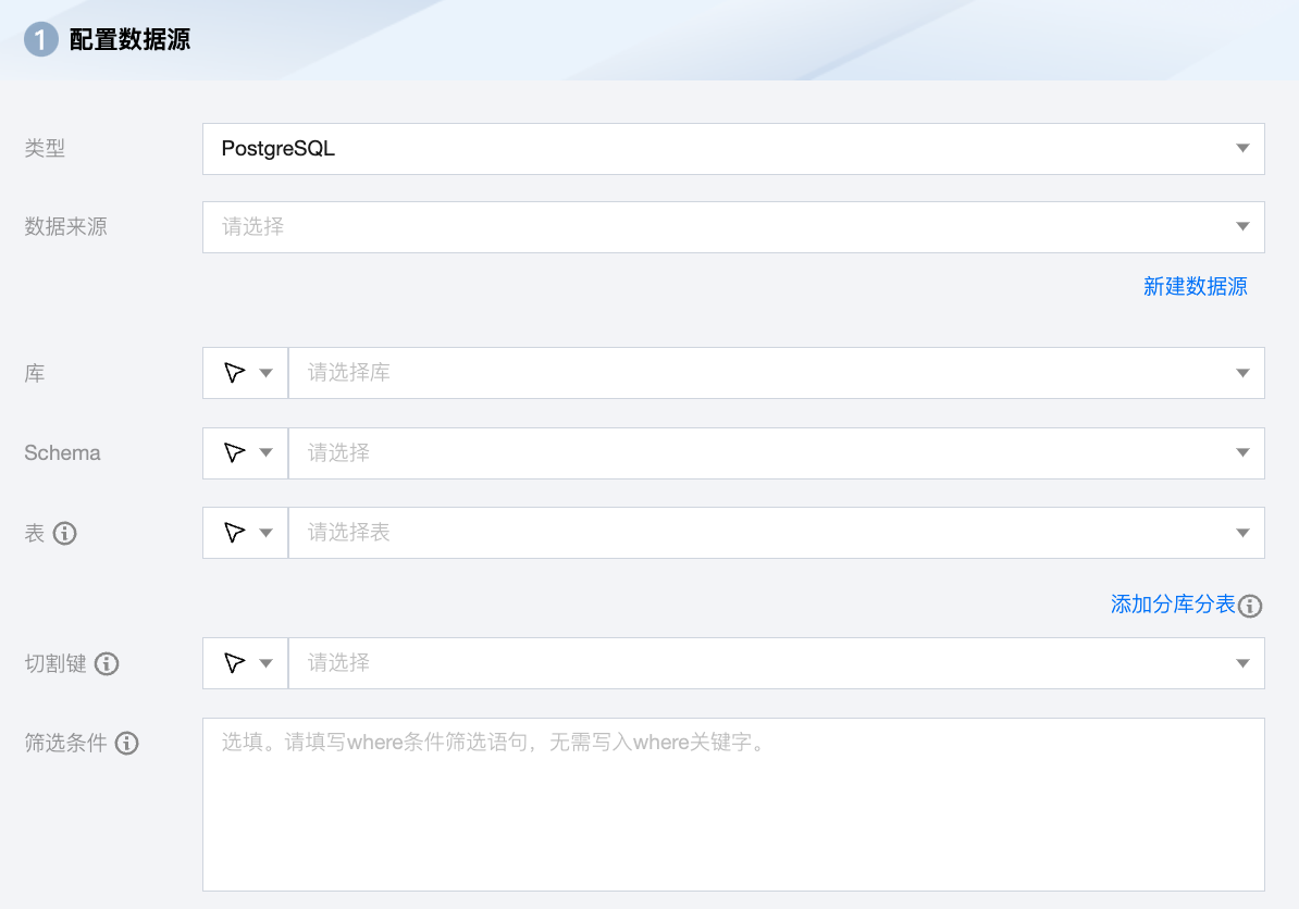 筛选条件(选填) | PostgreSQL 根据指定的 where 条件拼接 SQL,并根据该 SQL 进行数据抽取。例如测试时,可以将 where 条件指定实际业务场景,通常会选择当天的数据进行同步,将 where 条件指定为 id>2 and sex=1。 |