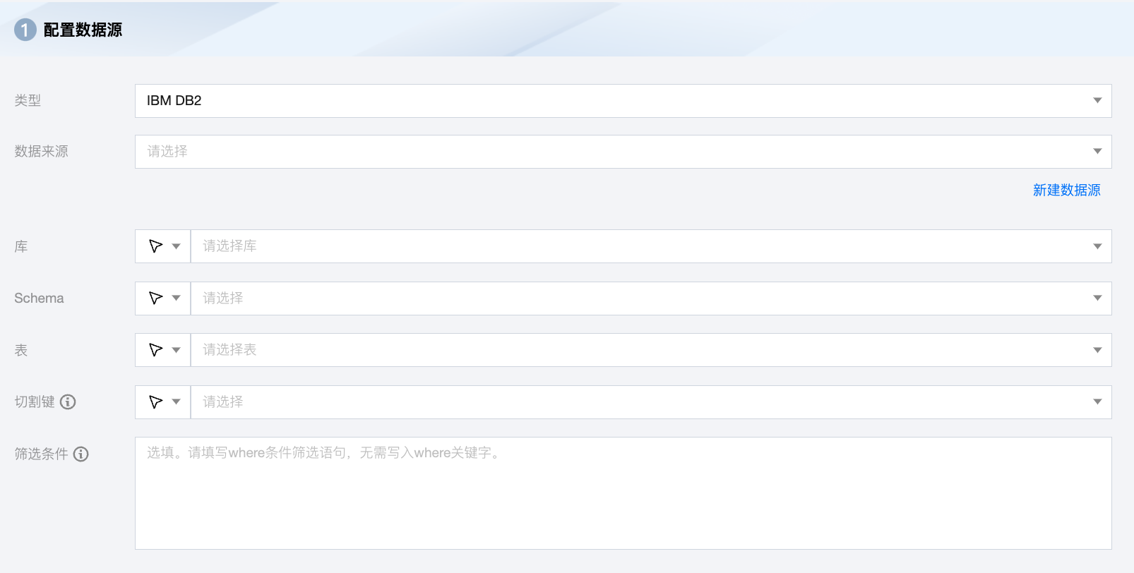 筛选条件(选填) | DB2 根据指定的 where 条件拼接 SQL,并根据该 SQL 抽取数据。在实际业务场景中,通常会选择当天的数据进行同步,可以指定 where 条件为 gmt_create>$bizdate。where 条件可以有效地进行业务增量同步。如果该值为空,代表同步全表所有的信息。 |