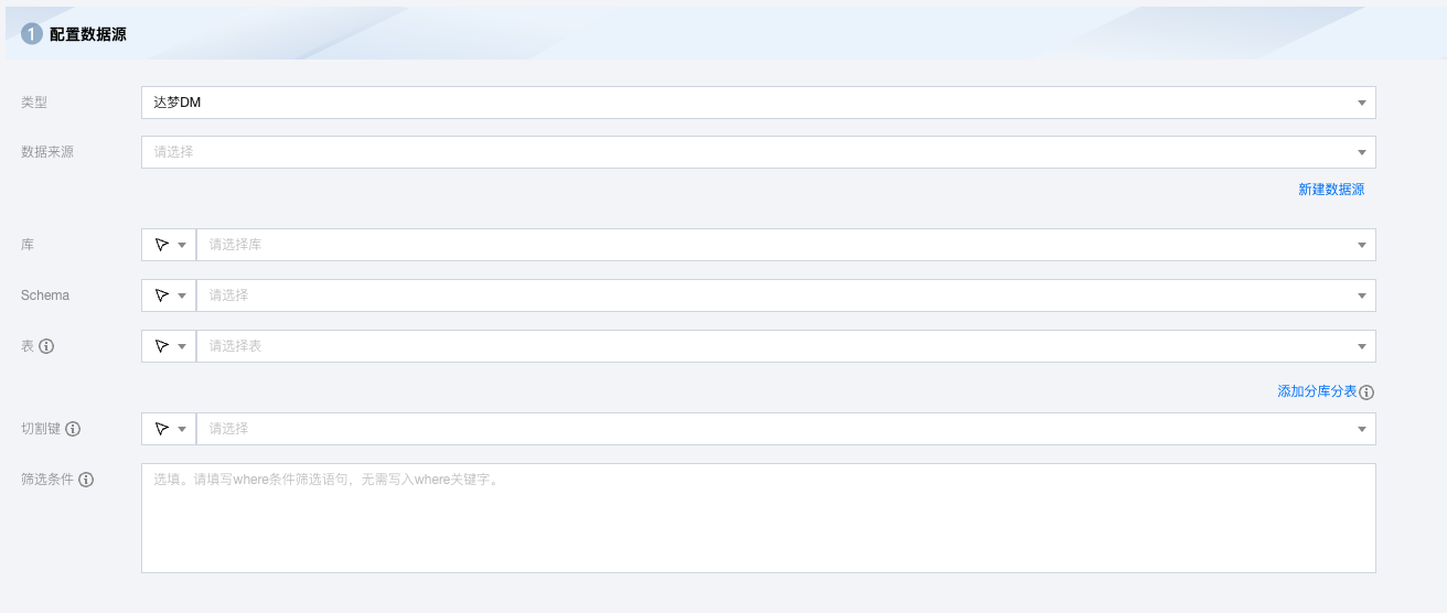 添加分库分表 | 可创建多个数据源并添加对应的表对象。 注意: 分库分表情况下选择的多个表对象需保证 Schema 信息一致(包括字段名称、字段类型)。数据字段模块内系统默认展示第一个数据源的第一张表的元数据字段信息,若多表间字段不一致可能会导致运行失败。 |