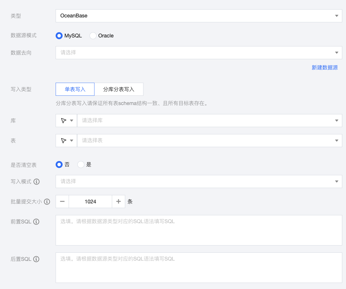 写入类型 (MySQL 兼容模式) | 单表写入:支持写入单表 分库分表写入:支持一次性写入同一个数据源内分库分表的 MySQL 表中,分库分表写入请保证所有表 schema 结构一致、且所有目标表存在。 |
