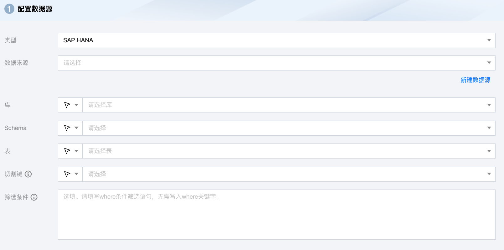 筛选条件(选填) | 根据数据类型填写对应筛选语句,该语句会作为将要同步数据的筛选条件,暂时不支持 limit 关键字过滤,SQL 语法与选择的数据源一致。 |