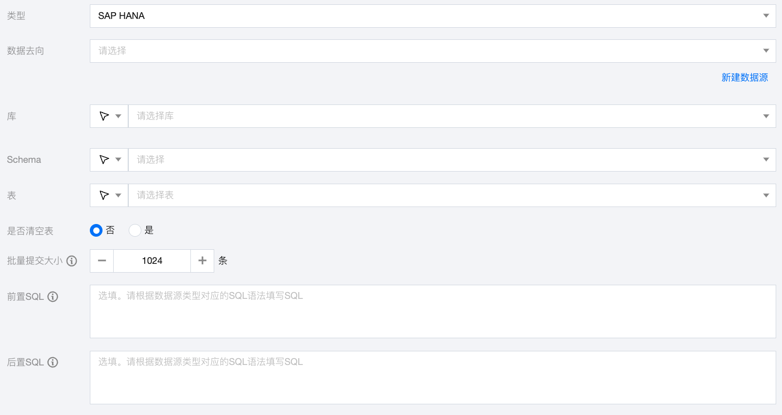 前置 SQL(选填) | 执行同步任务之前执行的 SQL 语句,根据数据源类型对应的正确 SQL 语法填写 SQL,例如,执行前清空表中的旧数据(truncate table tablename)。 |