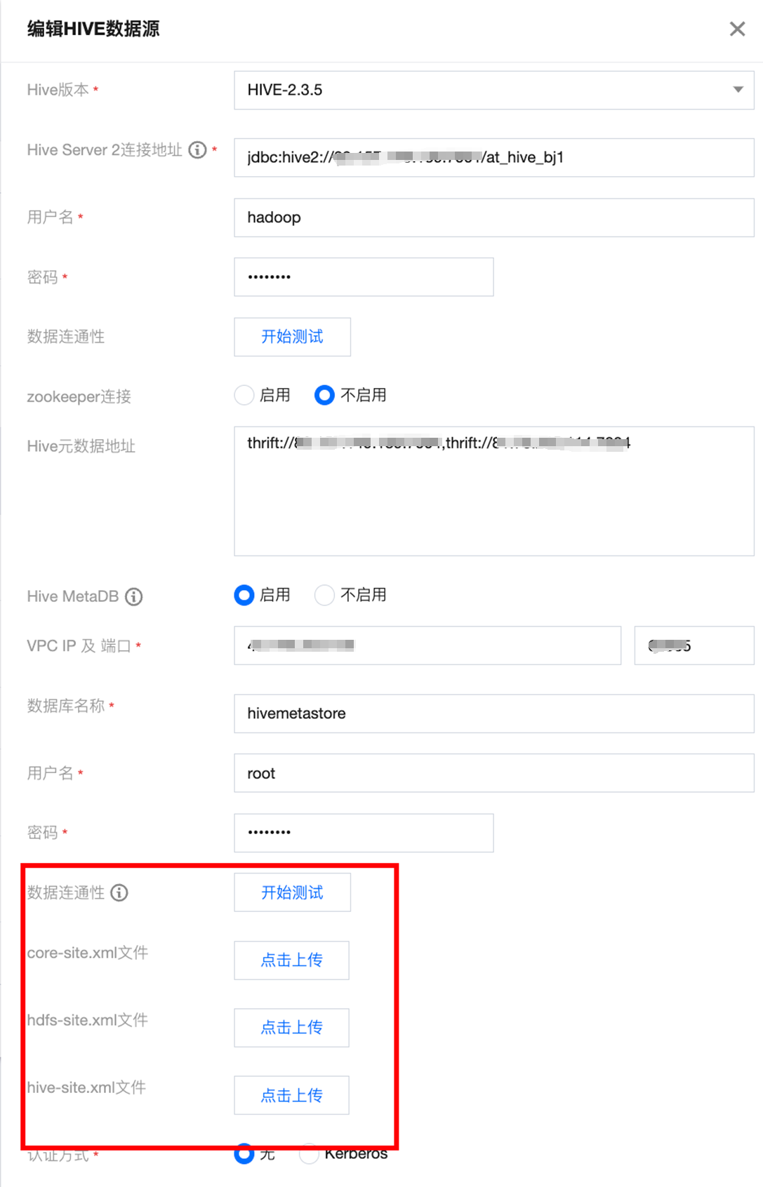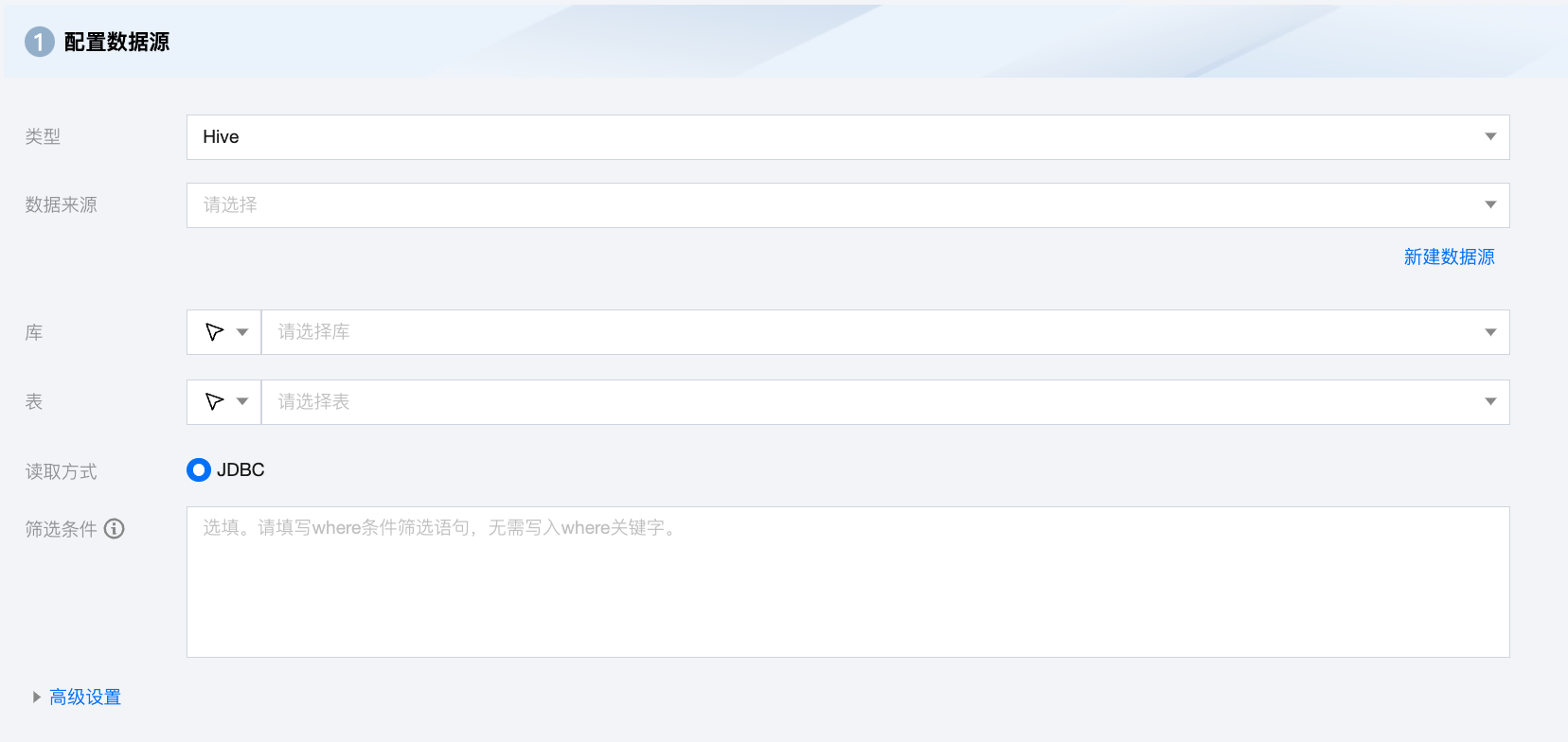 筛选条件(选填) | 基于 Hive JDBC 方式读取数据时,支持使用 Where 条件做数据过滤,但是此场景下,Hive 引擎底层可能会生成 MapReduce 任务,效率较慢 |