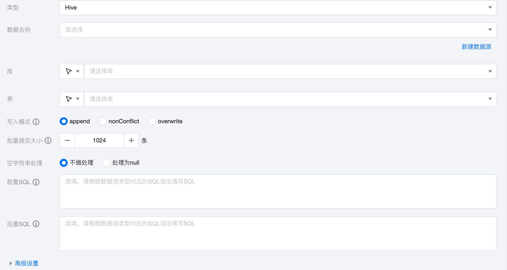 数据去向 | 需要写入的 Hive 数据源。 |