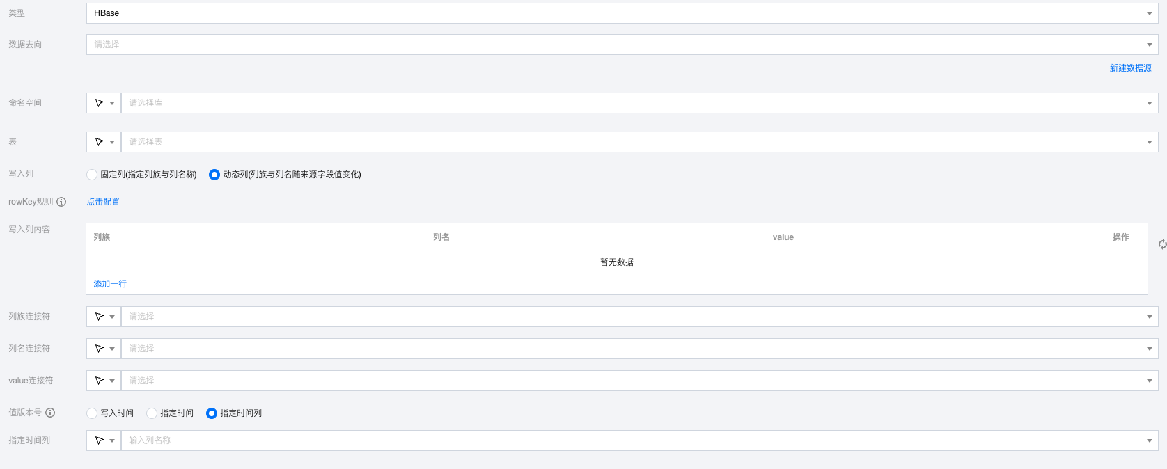 写入列 | HBase 支持两种方式写入列: 固定列(指定列族与列名称)。 动态列(列族与列名随来源字段值变化),需要手动配置列内容、列族连接符、列名连接符和 value 连接符(可选:' \\u001 ' 、 ' | ' 、 ' :' 、 ' , ' )。 |