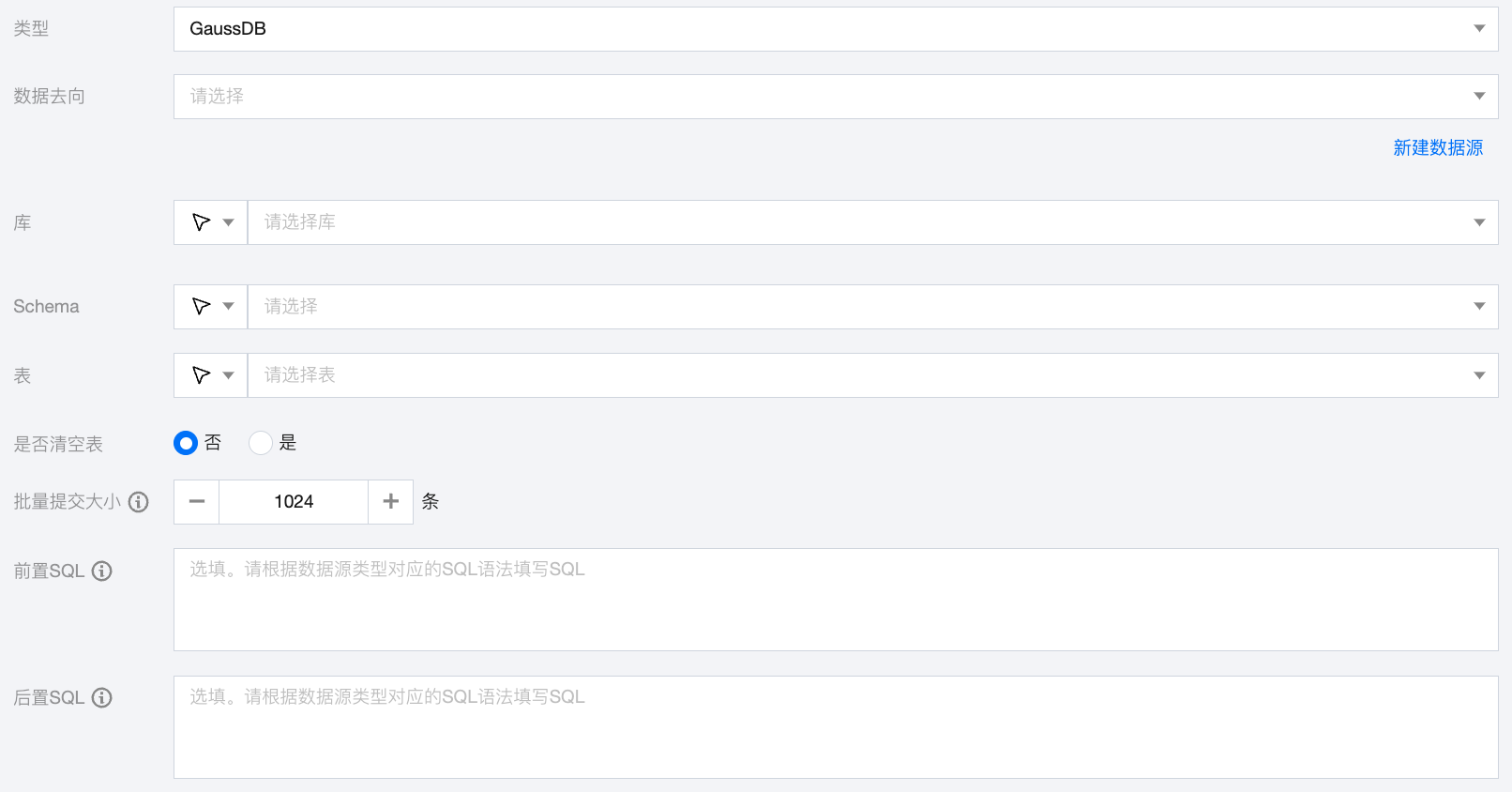 前置 SQL(选填) | 执行同步任务之前执行的 SQL 语句,根据数据源类型对应的正确 SQL 语法填写 SQL,例如,执行前清空表中的旧数据(truncate table tablename)。 |
