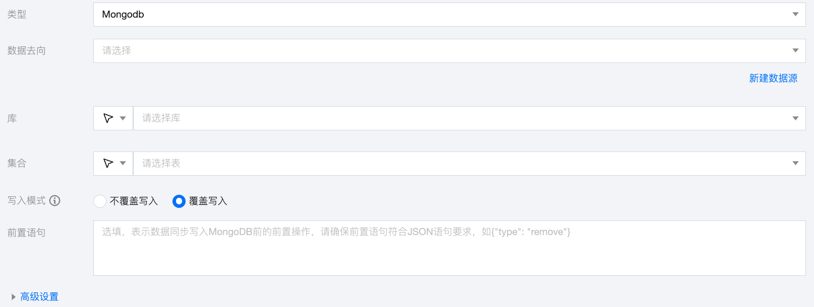 前置语句 | 选填,表示数据同步写入 MongoDB 前的前置操作,请确保前置语句符合 JSON 语句要求,如{"type": "remove"} |