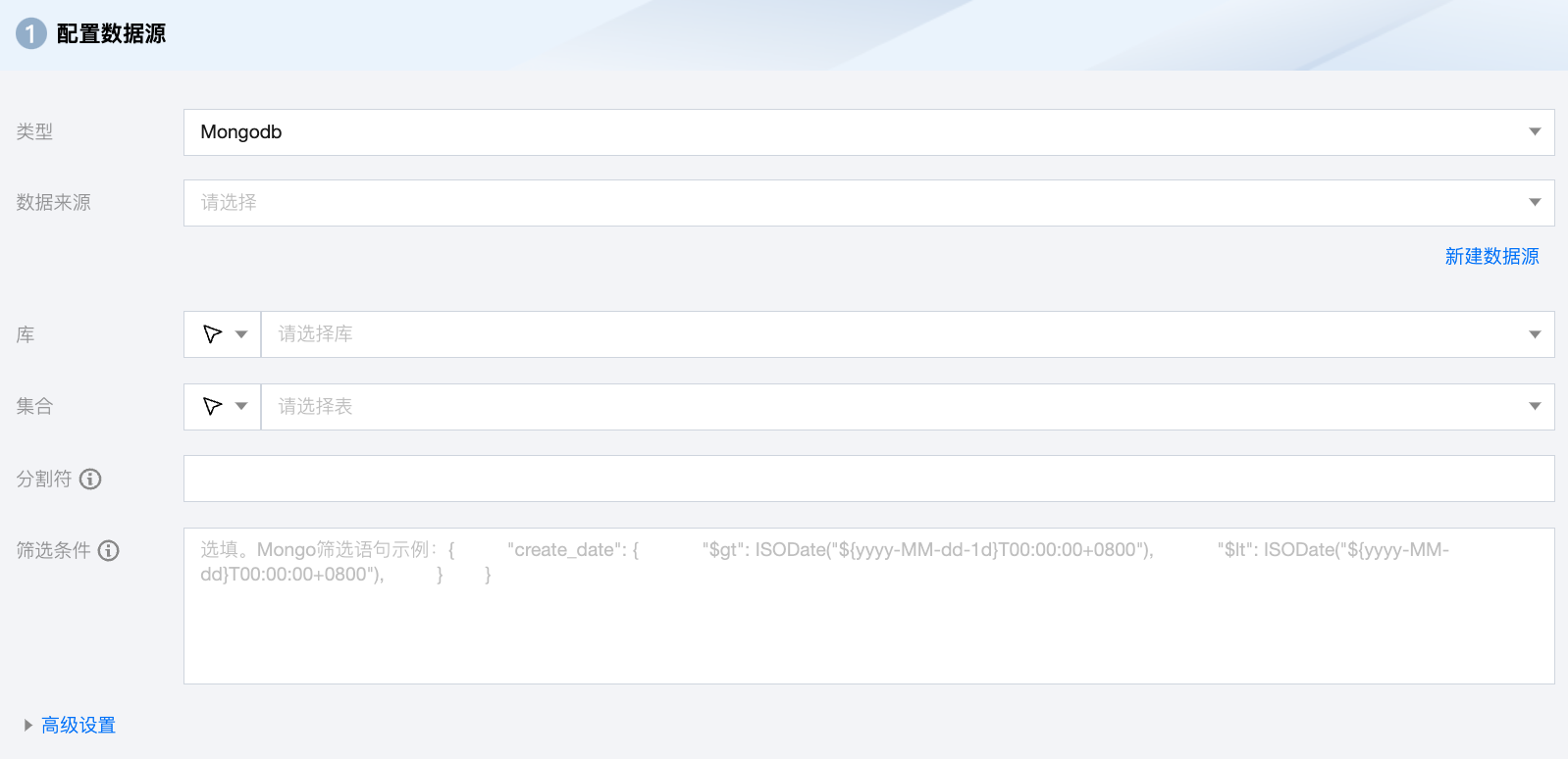 数据去向 | 选择当前项目中可用的 Mongodb 数据源。 |