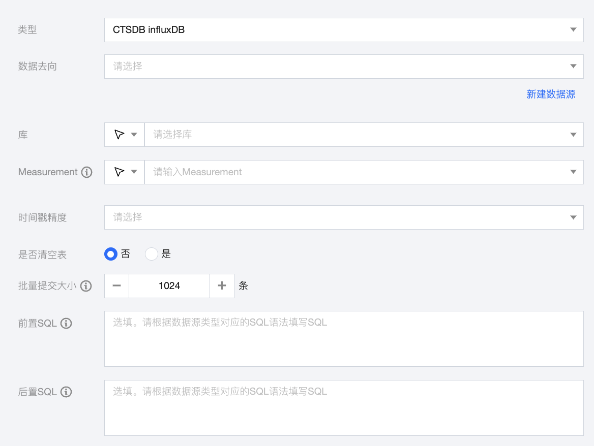 数据去向 | 选择当前项目中可用的 CTSDB influxDB 数据源。 |