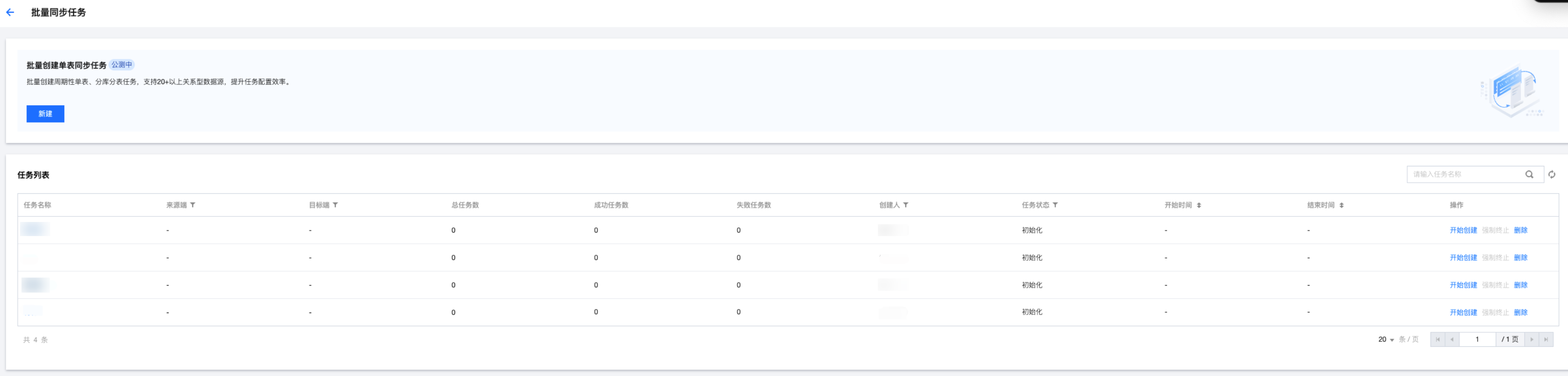 | 删除 | 删除未开始或已完成的批量创建单表任务。 |