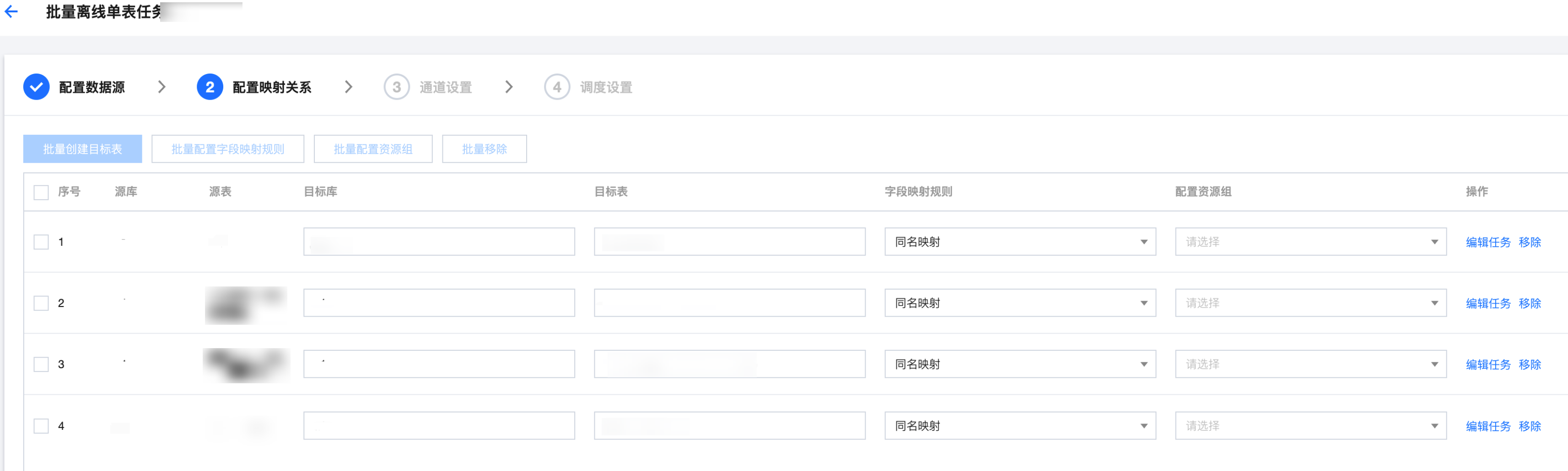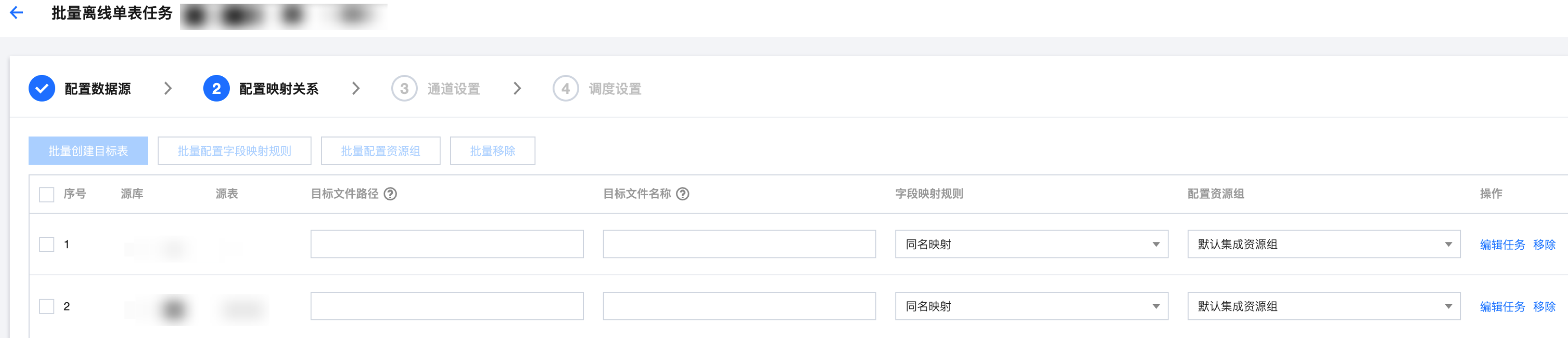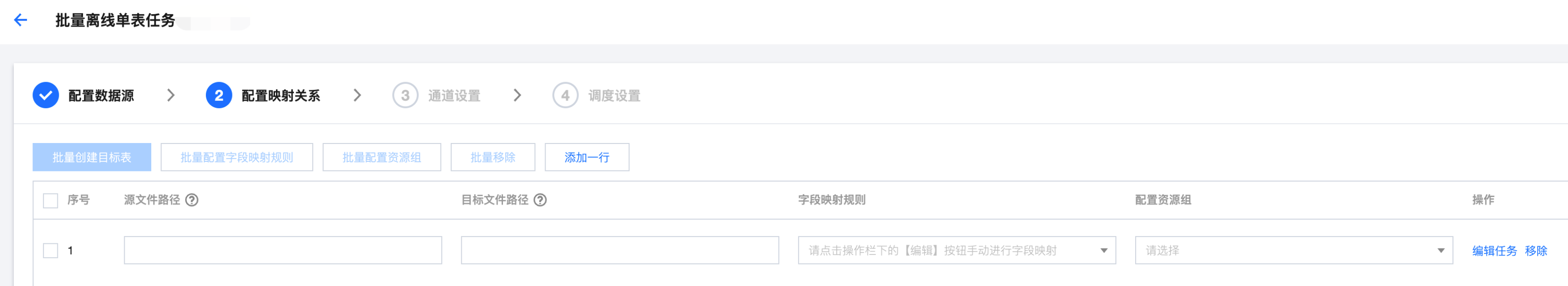 批量配置字段映射规则 | | 勾选列表后,支持批量配置映射关系,可选择同名映射、同行映射。 |