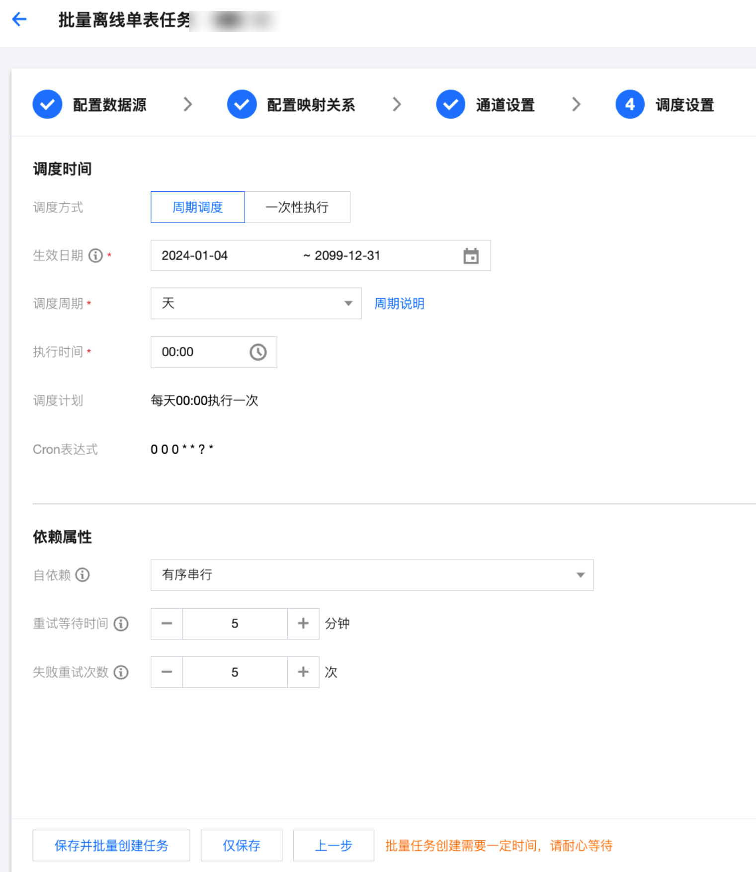 调度时间 | 调度方式 | 周期调度:任务根据配置调度计划周期运行。 一次性执行:任务仅在指定时间运行一次。 |