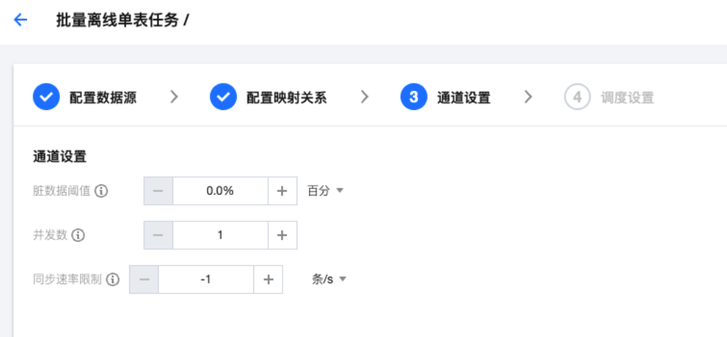 同步速率限制 | | 按照流量或记录条数限制同步速率以保护数据来源端或者数据去向端的读写压力。该值为最大运行速率,默认-1表示不限制速率。 |