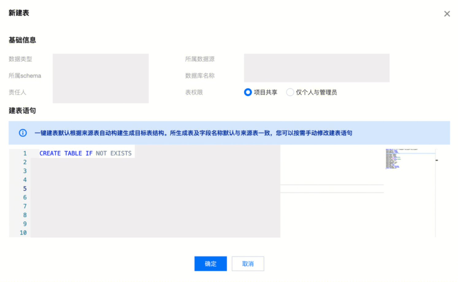 创建 | | 创建写入端的数据表,根据来源表自动构建生成目标表结构,支持手动修改键表语句。 ![]() 说明: 支持以下链路创建写入端的数据表: MySQL,Oracle,SQL Server,PostgreSQL -> Hive MySQL,TDSQL-C MySQL,PostgreSQL -> Doris MySQL, TDSQL-C MySQL,TDSQL MySQL,Oracle,SQL Server,PostgreSQL,达梦DM -> Iceberg MySQL, TDSQL-C MySQL,TDSQL MySQL,Oracle,OceanBase,PostgreSQL,达梦DM -> TChouse-P |