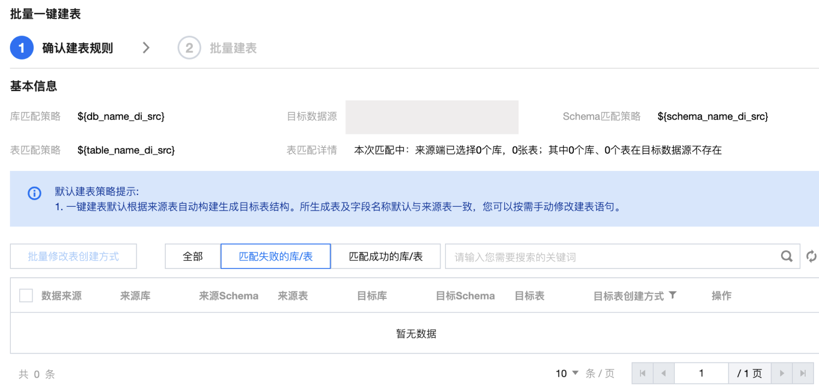 批量创建目标表 | | 勾选列表后,可批量创建写入端的数据表。 确认键表规则:确认键表信息如数据来源、来源库等,支持预览/编辑表语句。 批量键表:展示键表结果,支持查看键表语句、重试。 ![]() |