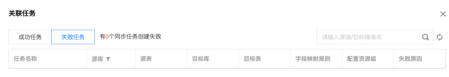 失败任务数 | | 展示已创建失败的单表任务数(60秒刷新一次),点击后可查看具体的任务详情,支持重试操作。 ![]() |