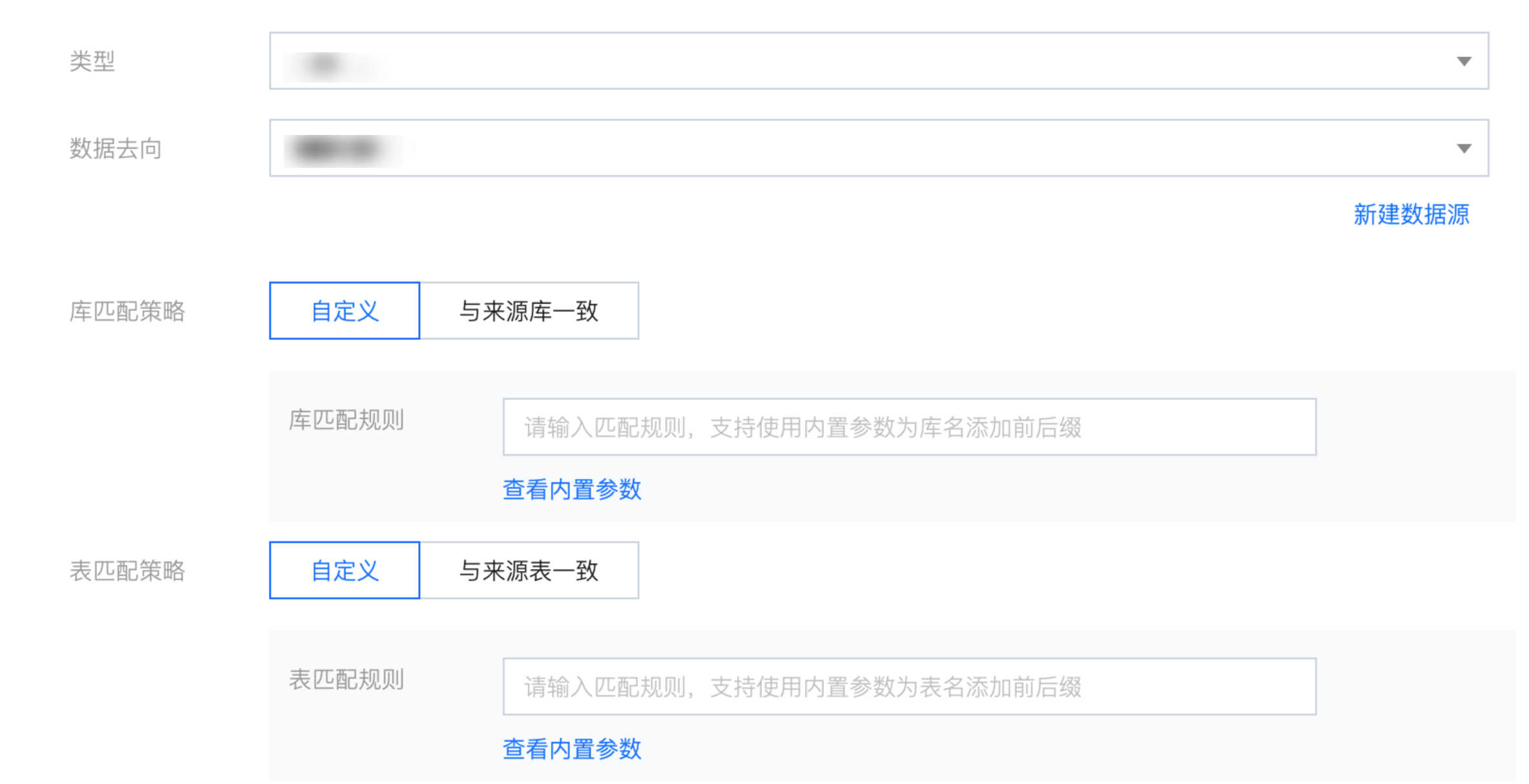 库匹配策略 | 与来源库同名:匹配与读取节点所选择的数据库名称一致的数据库。 自定义:需输入匹配规则,支持使用内置参数和字符串组合生成目标库名称。 |