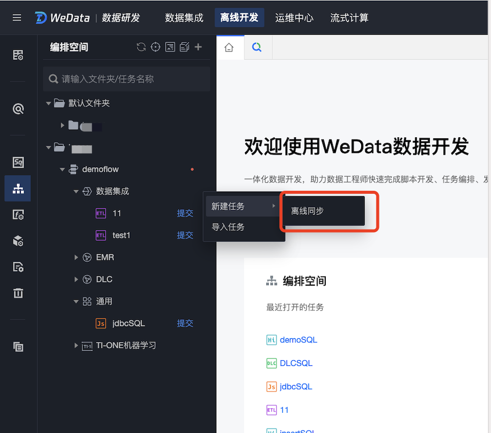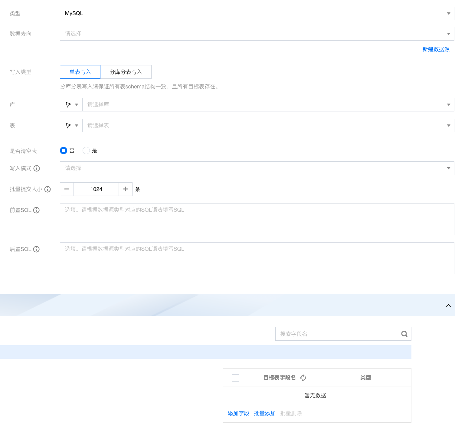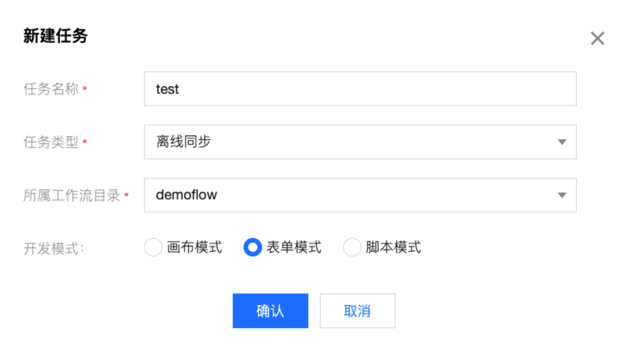 任务模式 | 表单模式:仅提供读取、写入节点,适用于单表至单表固定字段同步。适用于 ODS 层无需数据清洗环节的数据同步。 画布模式:提供读取、写入、转换三类节点。适用于包含清洗环节、多对多数据链路。 脚本模式:支持初始化的脚本模式配置页面,支持用户选择不同的数据来源、数据目标,展示对应的脚本模板: 用户需要先选择数据来源与数据目标,未选择的状态下不允许编辑。 选择后,展示对应的脚本模块。 在脚本中,用户可以手动编写数据源、连接信息等参数。 支持在脚本中写 sql 语句,将 querysql 写到 connection 中。 ![]() |