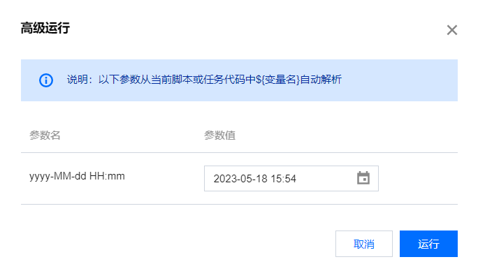 5 | 高级运行 | 单击图标,可运行当前带有变量的任务节点。系统会自动弹出代码中使用的时间参数和自定义参数。 ![]() |