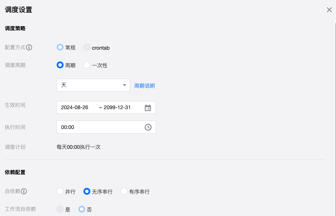 生效时间 | 调度时间配置的有效时间段,系统会在该时间范围内按照时间配置自动调度,超过有效期将不会再自动调度。 |