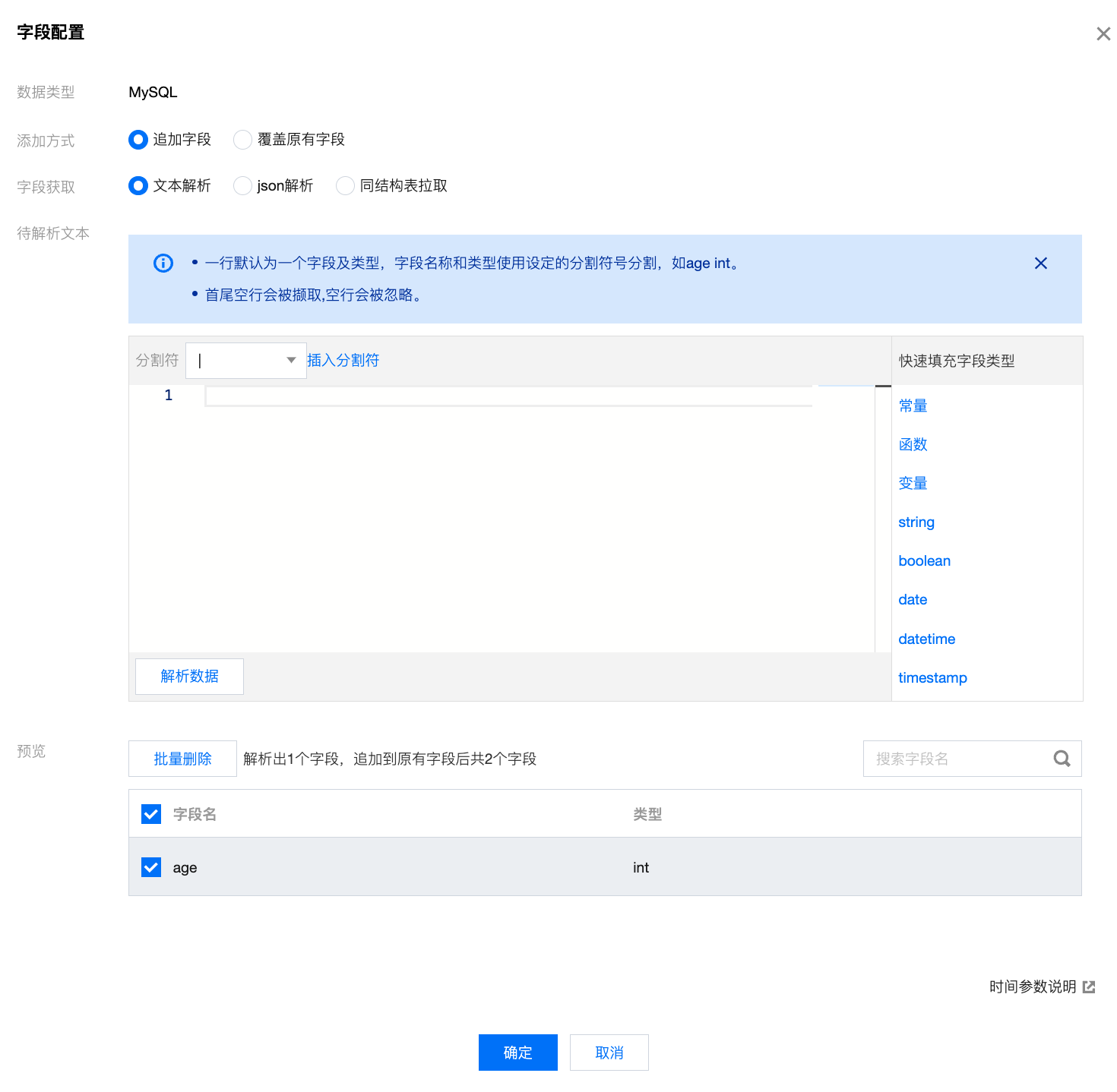 待解析文本 | 分割符 | 用于分割字段名称和类型,支持 tab、|、空格,例如"age|int"。 |