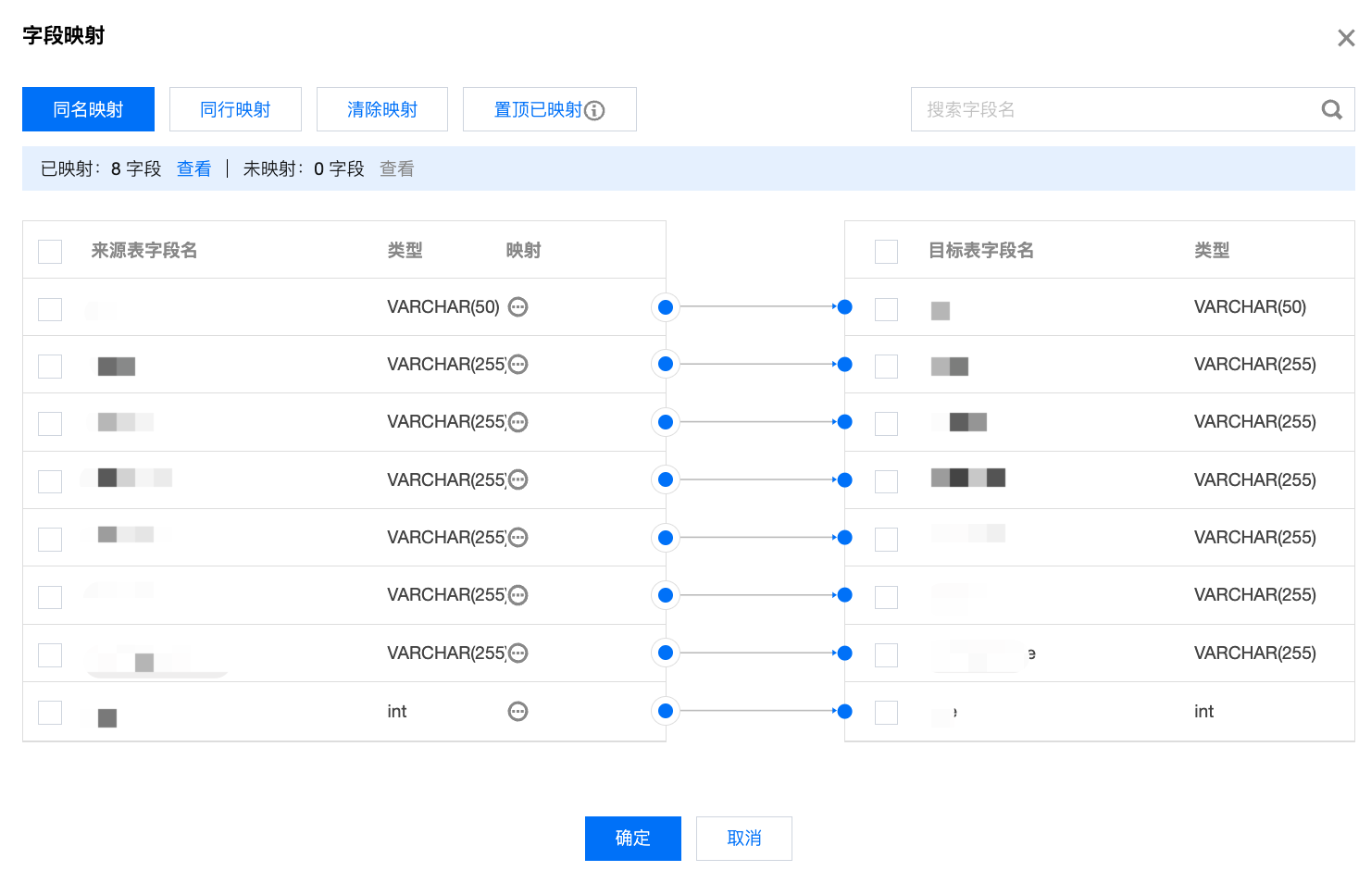 同名映射 | | 来源表字段与字段名称一致的目标表字段间建立映射关系。 |