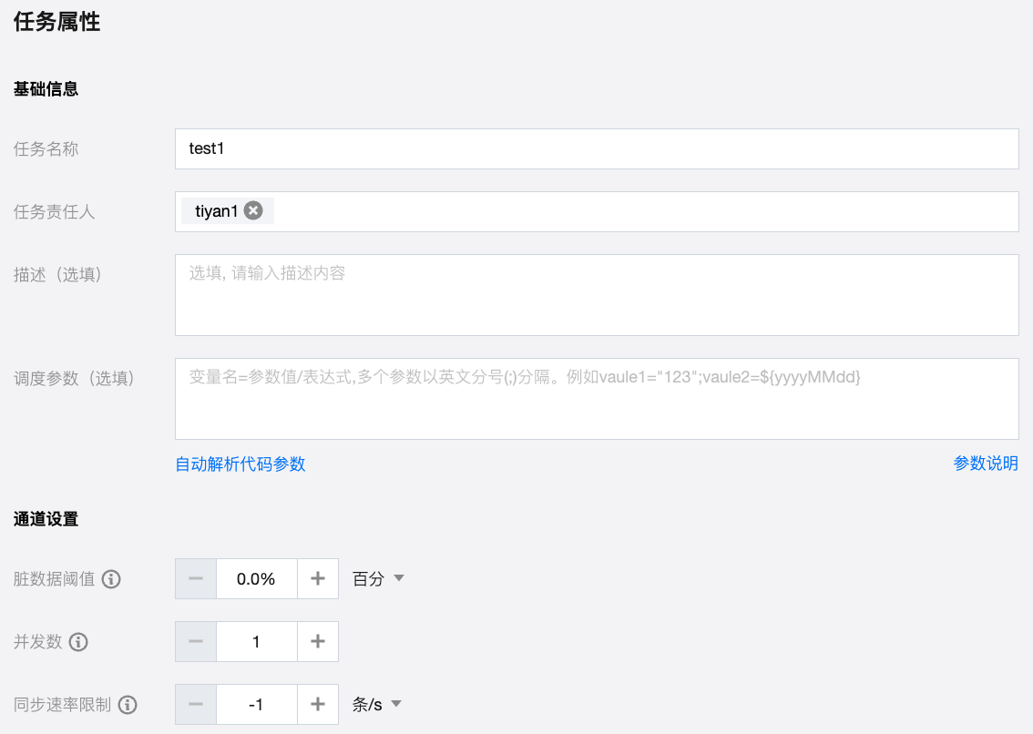 | 同步速率限制 | 按照流量或记录条数限制同步速率以保护数据来源端或者数据去向端的读写压力。该值为最大运行速率,默认-1表示不限制速率。 |