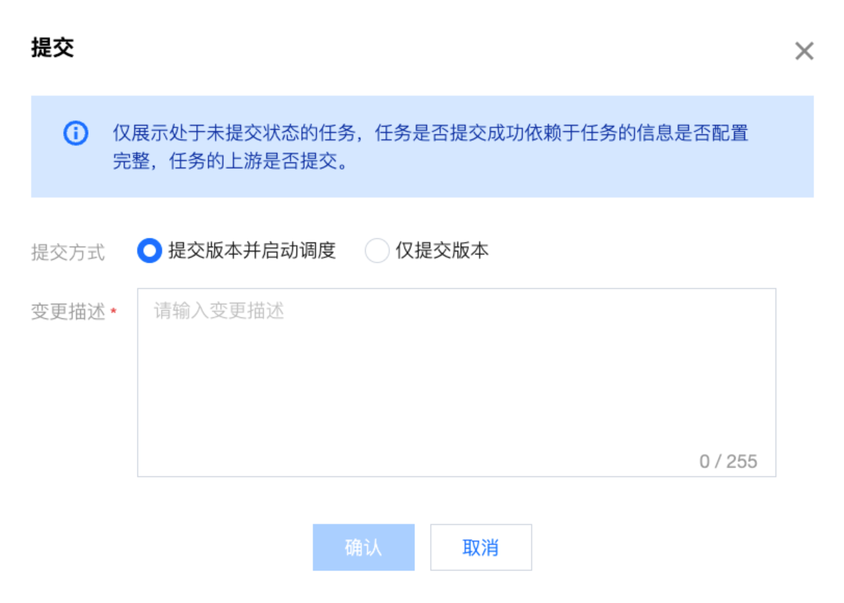 2 | 提交 | 单击图标,可提交任务节点到调度系统(节点基础内容、调度配置属性),并生成一个新的版本记录。 功能限制:任务的数据源和调度条件设置完整以后才可以正常提交。 |