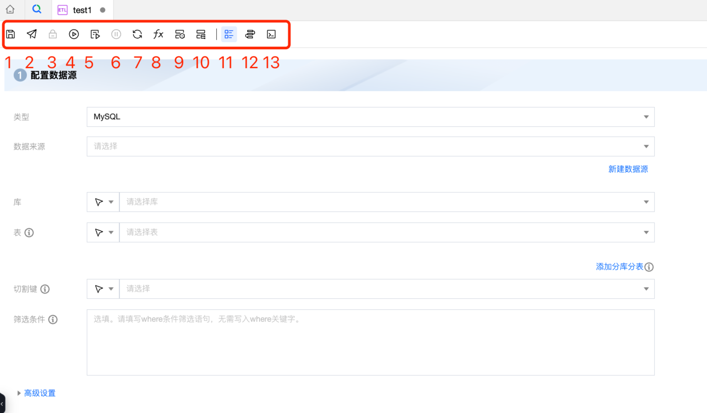 13 | 脚本转换 | 单击图标,将任务配置转换为脚本模式,转换后不支持转回表单/画布模式 |
