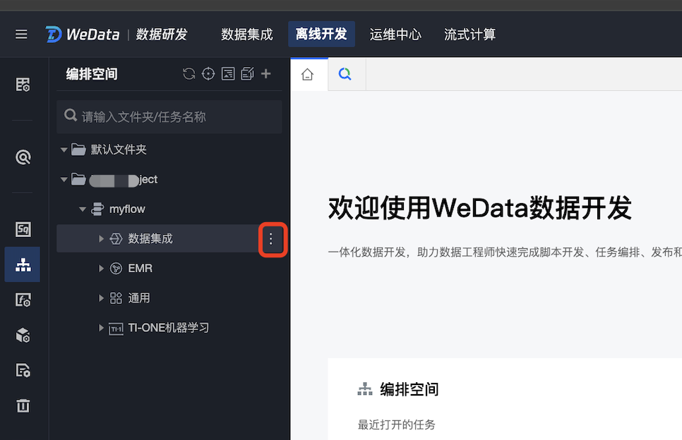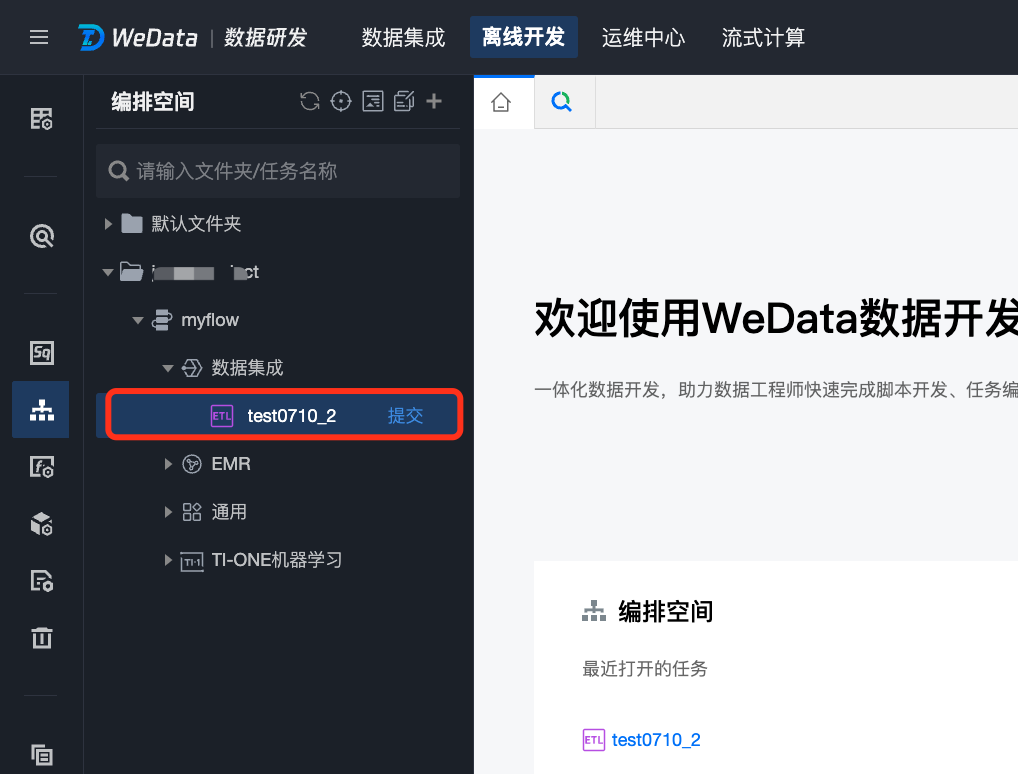 如果在数集成完成创建的离线同步任务需要跟其他任务进行编排或配置任务依赖,可以将未提交的离线同步任务从数据集成导入到数据开发 > 编排空间中,后续可在数据开发 > 编排空间配置调度,并提交任务到数据开发的运维中心。
