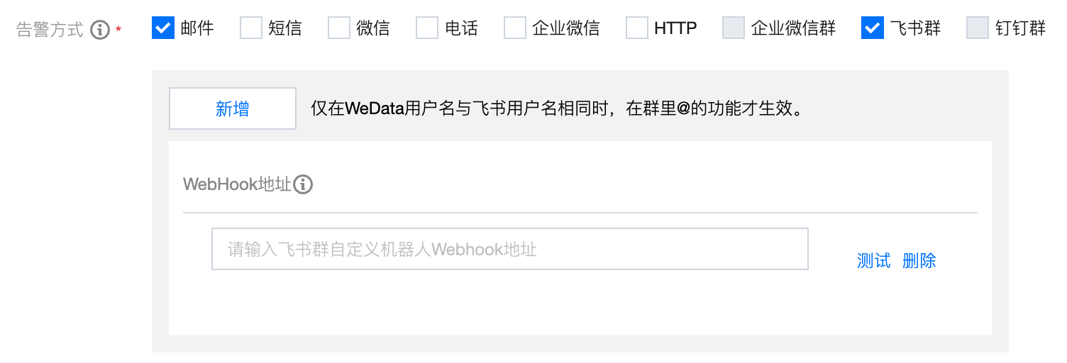 | 告警方式 | 告警规则出发后,告警信息的发送渠道。目前支持邮件、短信、微信、电话、企业微信、HTTP、企业微信群、飞书群、钉钉群的推送方式。手机、微信、邮件等账号可以在腾讯云个人中心 > 访问管理 > 用户模块中配置,企业微信账号在腾讯云个人中心 > 访问管理 > 联合账号中配置。Http 在告警渠道中配置。 ![]() |