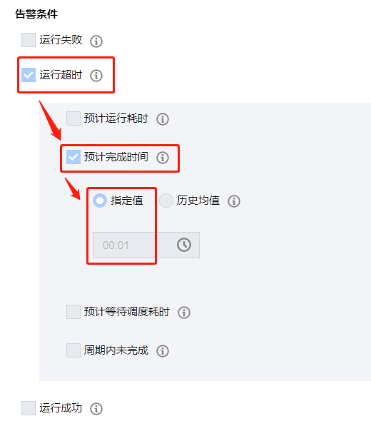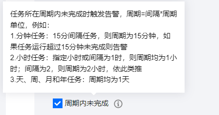 | 运行超时 | 被监控的任务生成实例调度或运行超出预设时间时进行告警,支持针对周期执行或补录、重跑执行进行配置。可以对“预计运行耗时”、“预计完成时间”、“预计等待调度耗时”和“周期内未完成”这四个关键时间要求设置规则触发条件。 预计运行耗时:从任务实例运行开始时间进行计算,未在耗时要求内完成则触发告警。可以使用“指定值”或“历史均值”来限定实例运行耗时。 指定值:在指定的小时分钟耗时要求时间内,实例未执行完成,则触发告警规则。 历史均值:取计算任务最近10次成功运行的实例运行耗时,再去除最大和最小值后取平均值,不足10次时设置无效。 ![]() 预计完成时间:从任务实例运行开始时间进行计算,未在规定时间点完成则触发告警。可以使用“指定值”或“历史均值”来规定实例需要运行完成的时间点。 指定值:在指定的小时/分钟时间点前,实例未执行完成,则触发告警规则。 历史均值:取计算任务最近10次成功运行的实例运行耗时,再去除最大和最小值后取平均值,不足10次时设置无效。 ![]() 预计等待耗时:限制从任务实例的计划调度时间到实际开始运行时间的间隔时间耗时。如果超过设置时间段还未运行,则触发告警。 ![]() 周期内未完成:任务实例在其当前运行周期内未运行完成时触发告警,周期=间隔*周期单位,例如: 分钟任务:15分间隔任务,则周期为15分钟,如果任务运行超过15分钟未完成则告警。 小时任务:指定小时或间隔为1时,则周期均为1小时;间隔为2,则周期为2小时,依此类推。 天、周、月和年任务:周期均为1天。 ![]() |