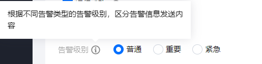 告警通知 | 告警级别 | 根据不同告警类型的告警级别,区分告警信息发送内容,目前提供普通、重要、紧急三种告警类型选择。 ![]() |
