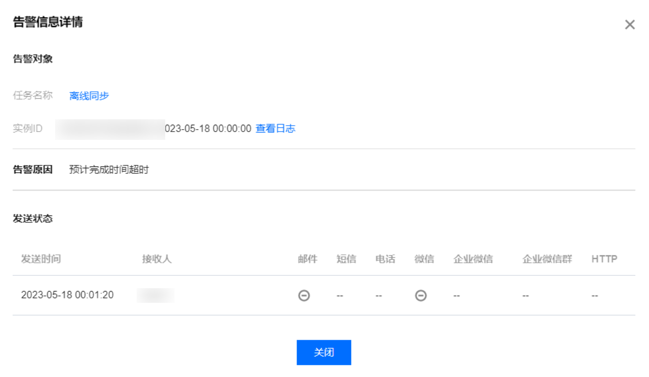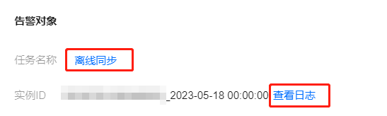 告警对象 | 显示触发告警信息的任务实例名称与实例 ID。 ![]() 任务名称:显示触发告警信息的计算任务的任务名称,单击任务名称会跳转到触发该告警信息的实例所在页面。 实例 ID:显示触发告警信息的实例 ID,单击查看日志会跳转到对应实例的日志信息页面。 |