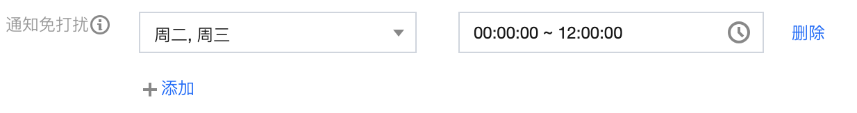 | 通知免打扰 | 支持设置通知的免打扰时间,免打扰时段内告警将不会发送,用户可以在告警信息中查看到告警记录。 免打扰支持按照星期、时间进行配置,支持配置多段免打扰时间。 ![]() |