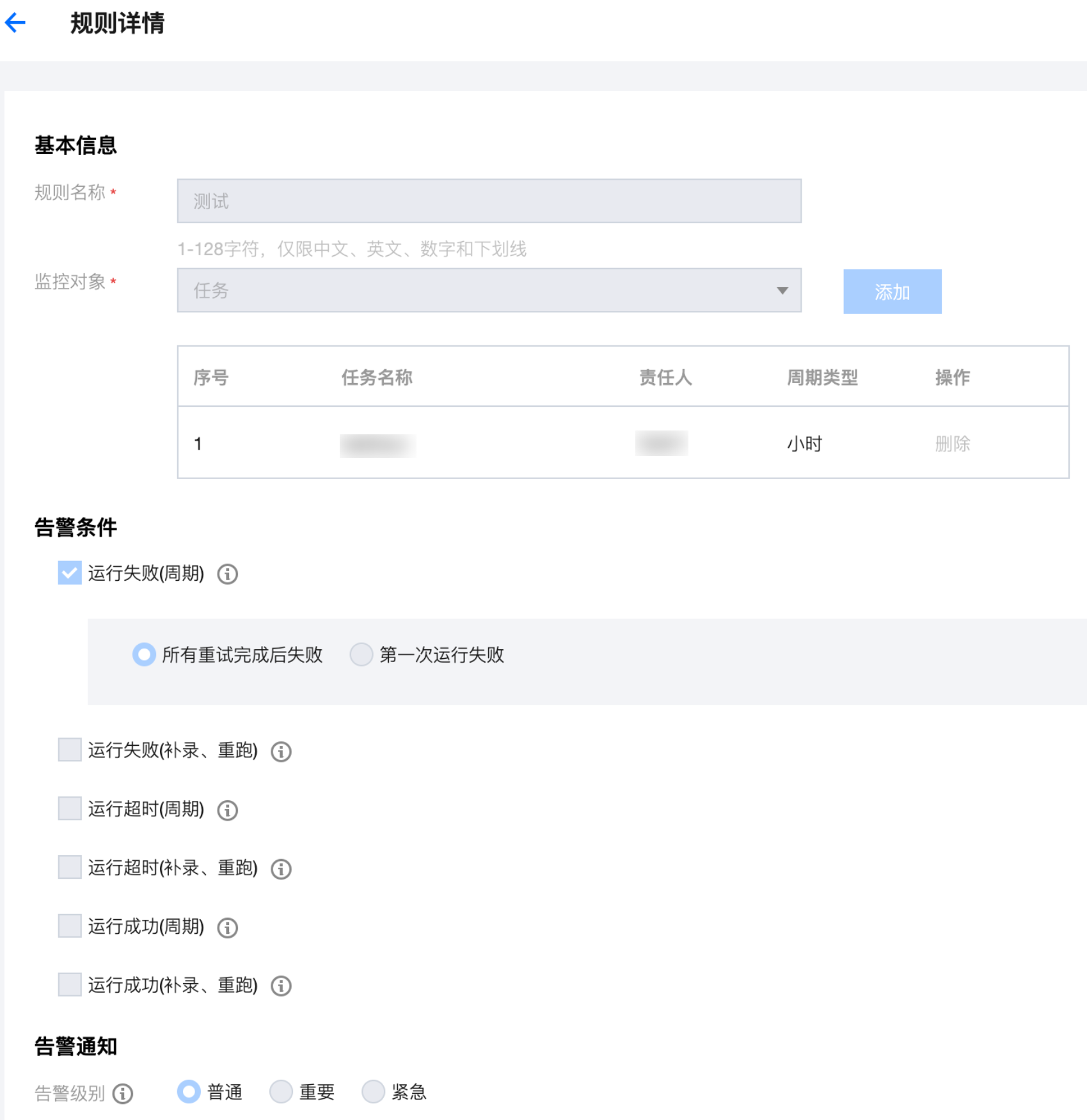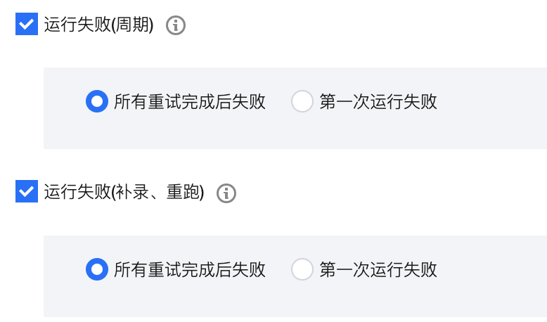告警条件 | 运行失败 | 被监控的任务生成实例运行失败时进行告警,支持针对周期执行或补录、重跑执行进行配置。可以选择“所有重试完成后失败”或“第一次运行失败”的规则触发条件。 所有重试完成后失败:根据计算任务调度策略中针对任务执行失败的情况,如果有失败重试的相关配置,则按照失败重试的次数执行后,实例均运行失败时,触发告警规则。 第一次运行失败:根据计算任务调度策略,第一次生成的实例运行失败后,触发告警规则。 ![]() |