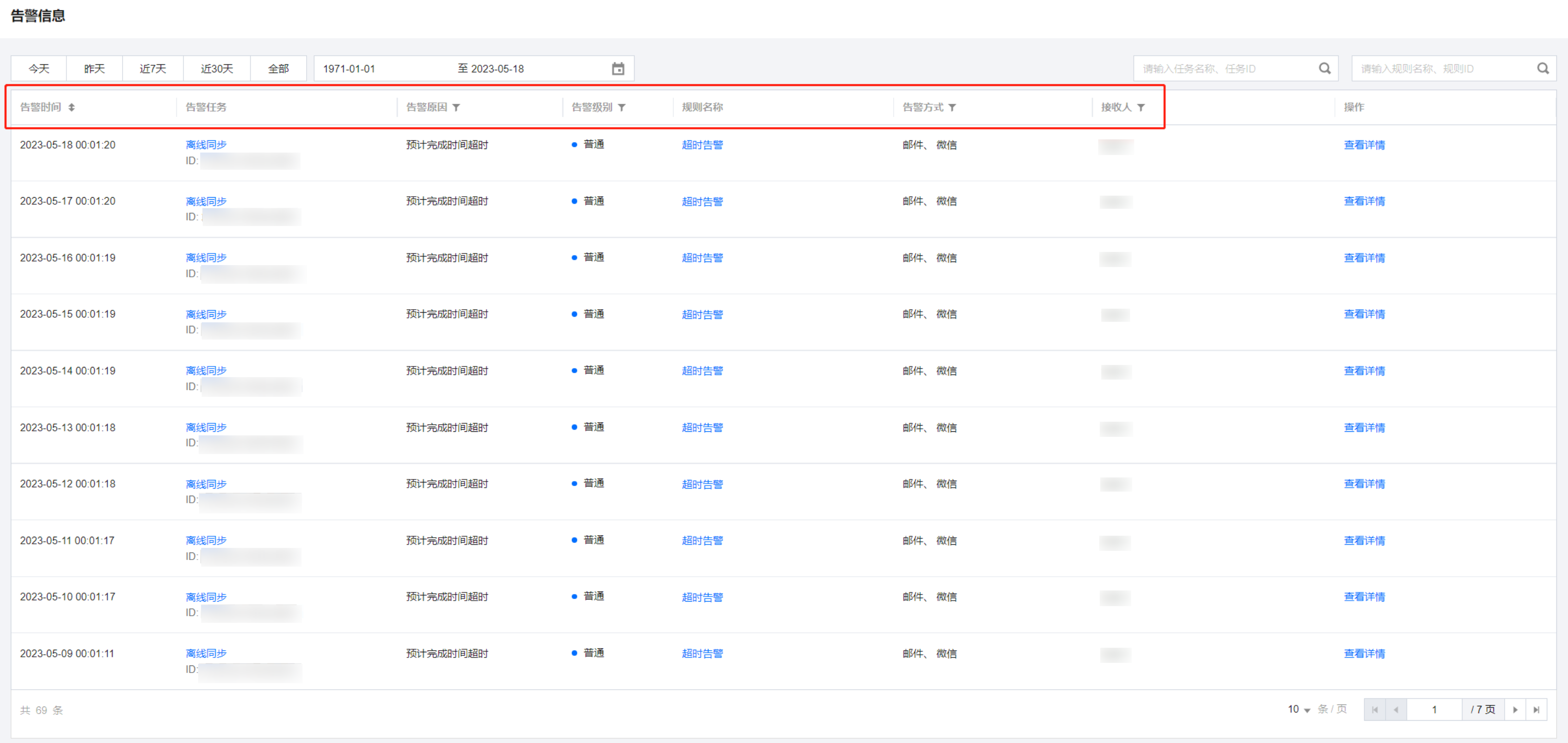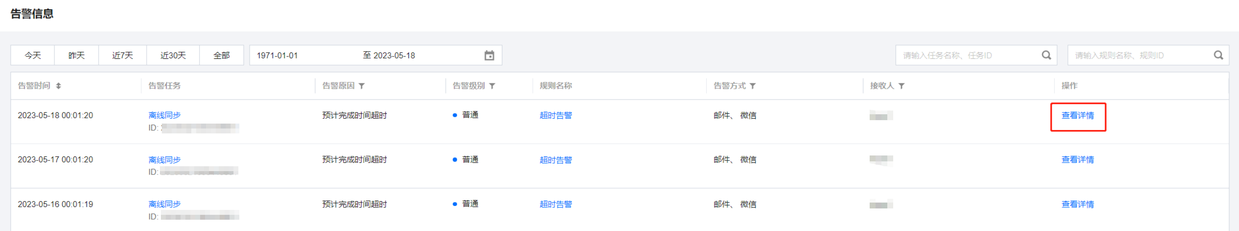 告警原因 | 根据配置的告警规则触发条件显示当前告警信息的被触发原因。 例如告警条件选择:运行超时>预计完成时间。 ![]() 则规则触发后显示的告警原因为:预计完成时间超时。 ![]() |