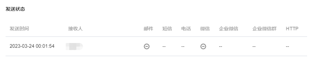 发送状态 | 显示当前告警信息的发送时间、接收人与发送渠道,从发送渠道的状态中可以看到各渠道下是否发送成功。 ![]() 发送时间:显示规则触发后向接收人发送告警信息的时间。 接收人:显示告警信息接收人。 发送渠道:使用不同图标显示各个渠道的告警信息发送状态。 |