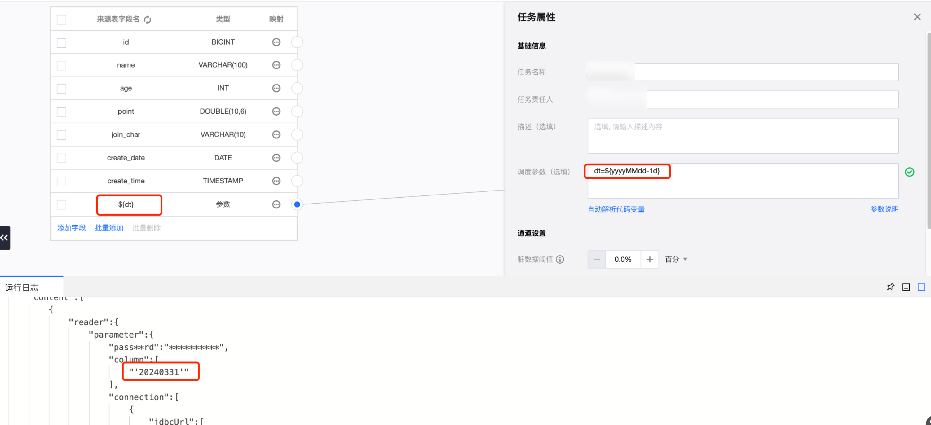 后 N 年 | ${yyyyMMdd+Ny} | 若引用 dt=${yyyyMMdd-1M},将执行替换:dt=20210610 若引用 dt=${yyyyMMdd-1d} ,将执行替换:dt=20210709 若引用 time=${yyyyMMddHHmmss-3h},将执行替换:time=20210710050000 若引用 ti=${yyyyMMddHHmmss-25m},将执行替换:ti=20210710073500 |