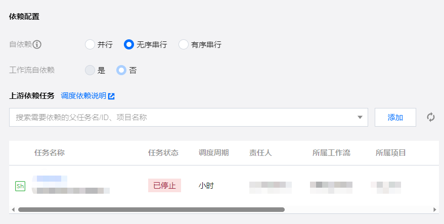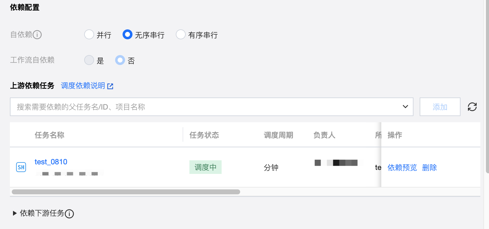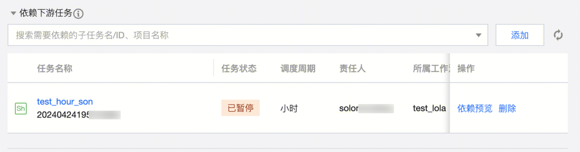 将搜索到的任务添加为依赖任务时,在依赖任务列表中会显示对应任务的信息,包括任务名称、任务状态、调度周期、负责人、所属工作流、所属项目、时间维度、实例范围、执行策略以及删除操作。