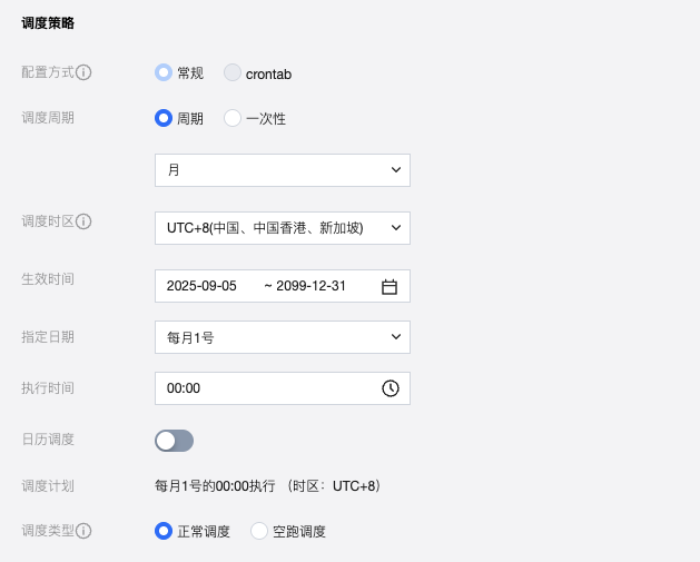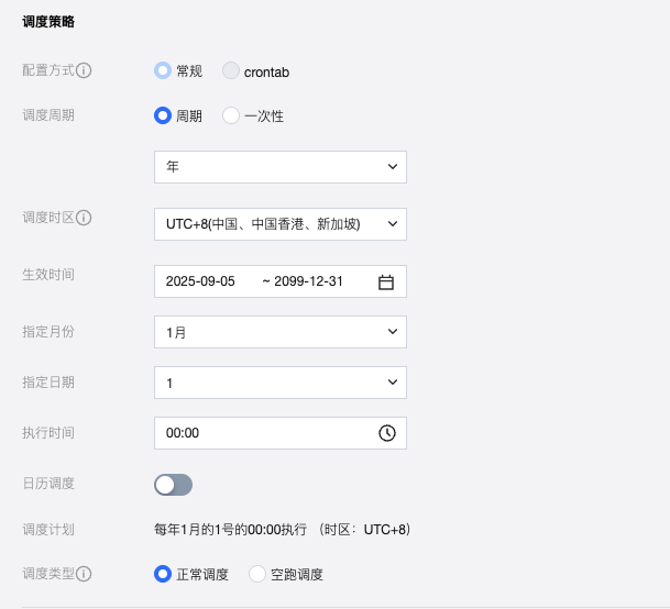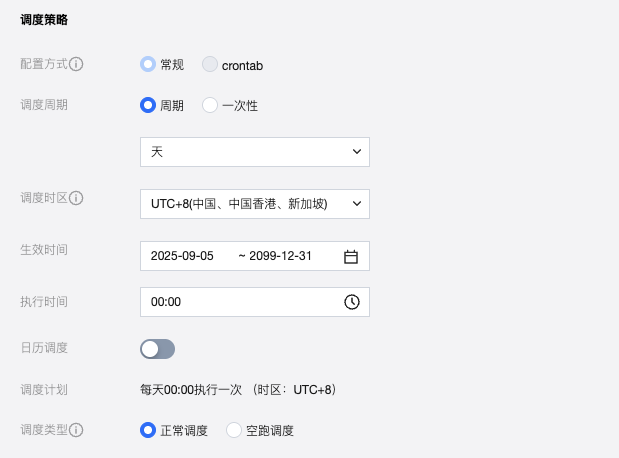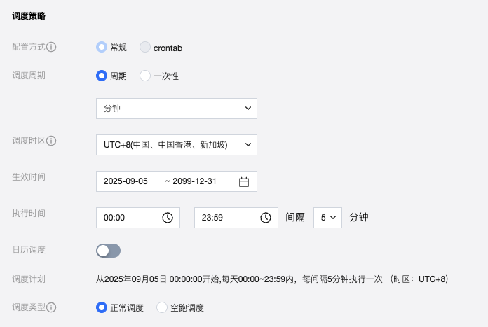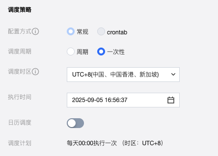 调度策略支持常规的周期性调度策略或一次性执行策略。