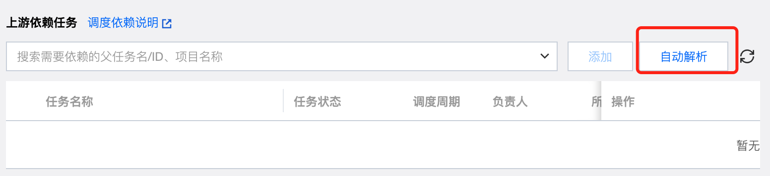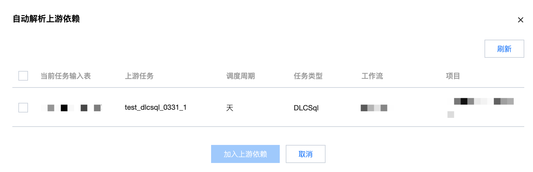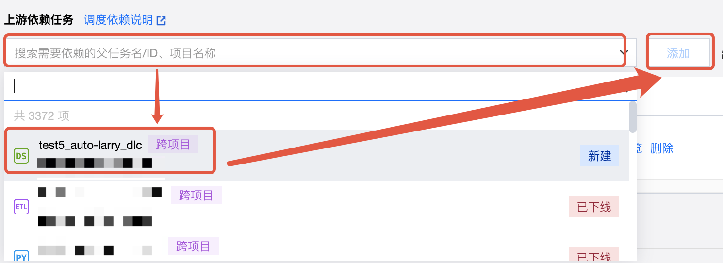 支持通过搜索任务名称、任务 ID、项目名称查找需要配置的上游依赖任务。